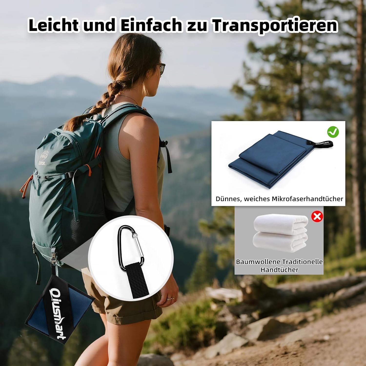 Комплект от 3 спортни кърпи от микрофибър: 3 различни цвята кърпи 50 x 100 см в тъмносиньо, черно и армейско зелено, включително аксесоари: преносима чанта за съхранение. Микрофибърните кърпи са меки, абсорбиращи и дишащи. Подходящи за различни поводи, като пътуване, дейности на открито, къмпинг, фитнес зала, плуване, сауна, спорт, фитнес и йога. Забележка: Моля, перете микрофибърната кърпа отделно за първи път, за да избегнете обезцветяване.