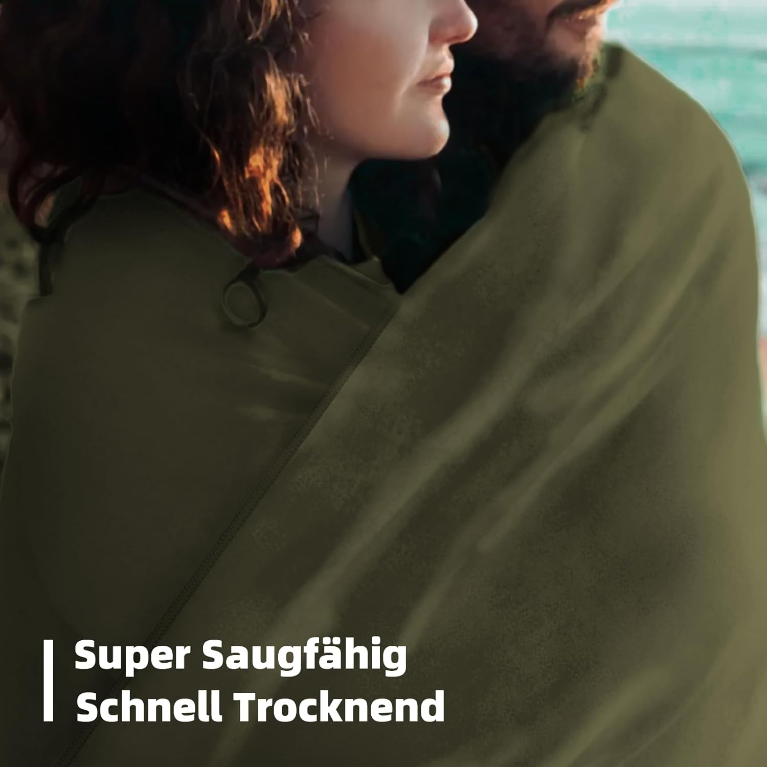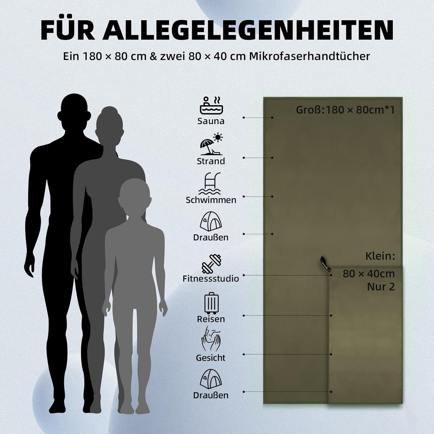 Комплект от 3 микрофибърни кърпи, големи (180 x 80 см) и 2 малки (80 x 40 см) бързосъхнещи микрофибърни фитнес кърпи, спортна кърпа, плажна кърпа, кърпа за баня и кърпа за пътуване (армиерско зелено)
