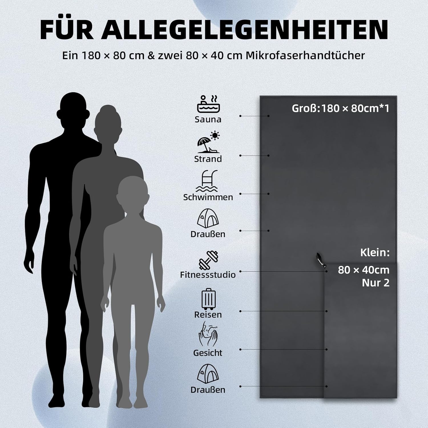 Комплект от 3 микрофибърни кърпи, големи (180 x 80 см) и 2 малки (80 x 40 см) бързосъхнещи микрофибърни фитнес кърпи, спортна кърпа, плажна кърпа, кърпа за баня и кърпа за пътуване (тъмносиви)