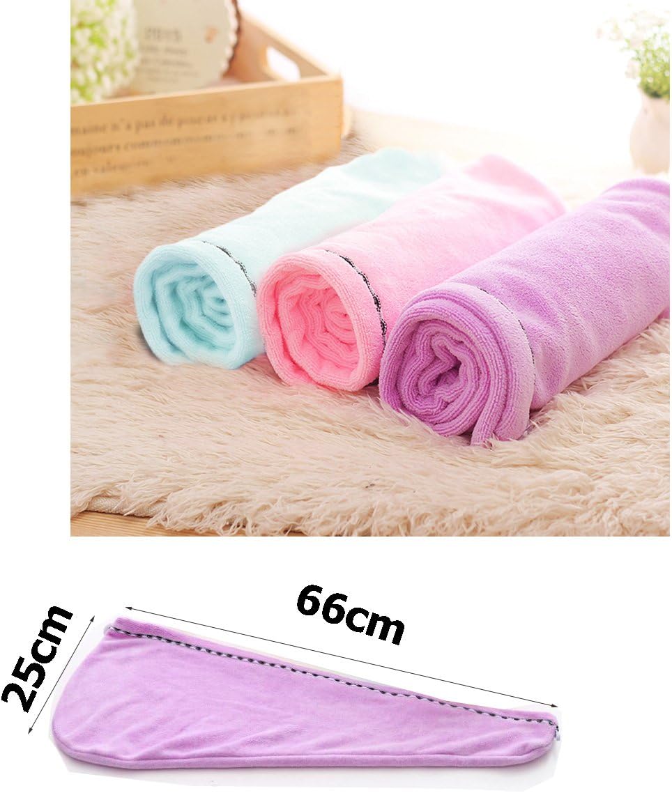 Комплект от 3 микрофибърни тюрбани за коса с копче за сушене на коса, супер абсорбиращи, усукани, подходящи за дълга, къса, къдрава, права коса, (розово, синьо, лилаво)