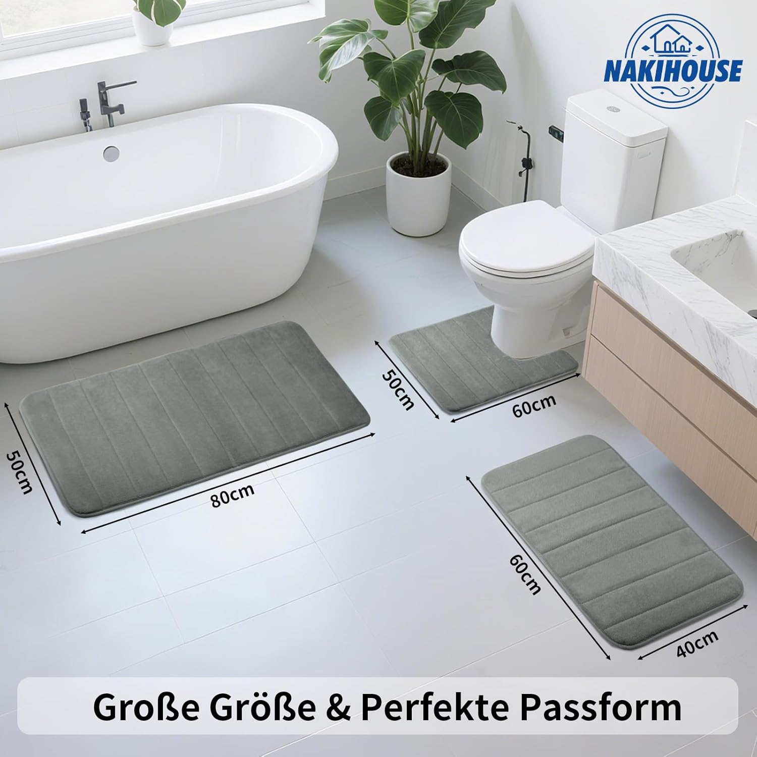 • Пълен комплект килими за баня: Нашият комплект от 3 килима за баня съдържа две килими за баня (80 x 50 см и 60 x 40 см) и U-образна тоалетна постелка (50 x 60 см) - идеална за всякакъв дизайн на банята. Пасва идеално като постелка за душ, тоалетна или класическа постелка за баня.