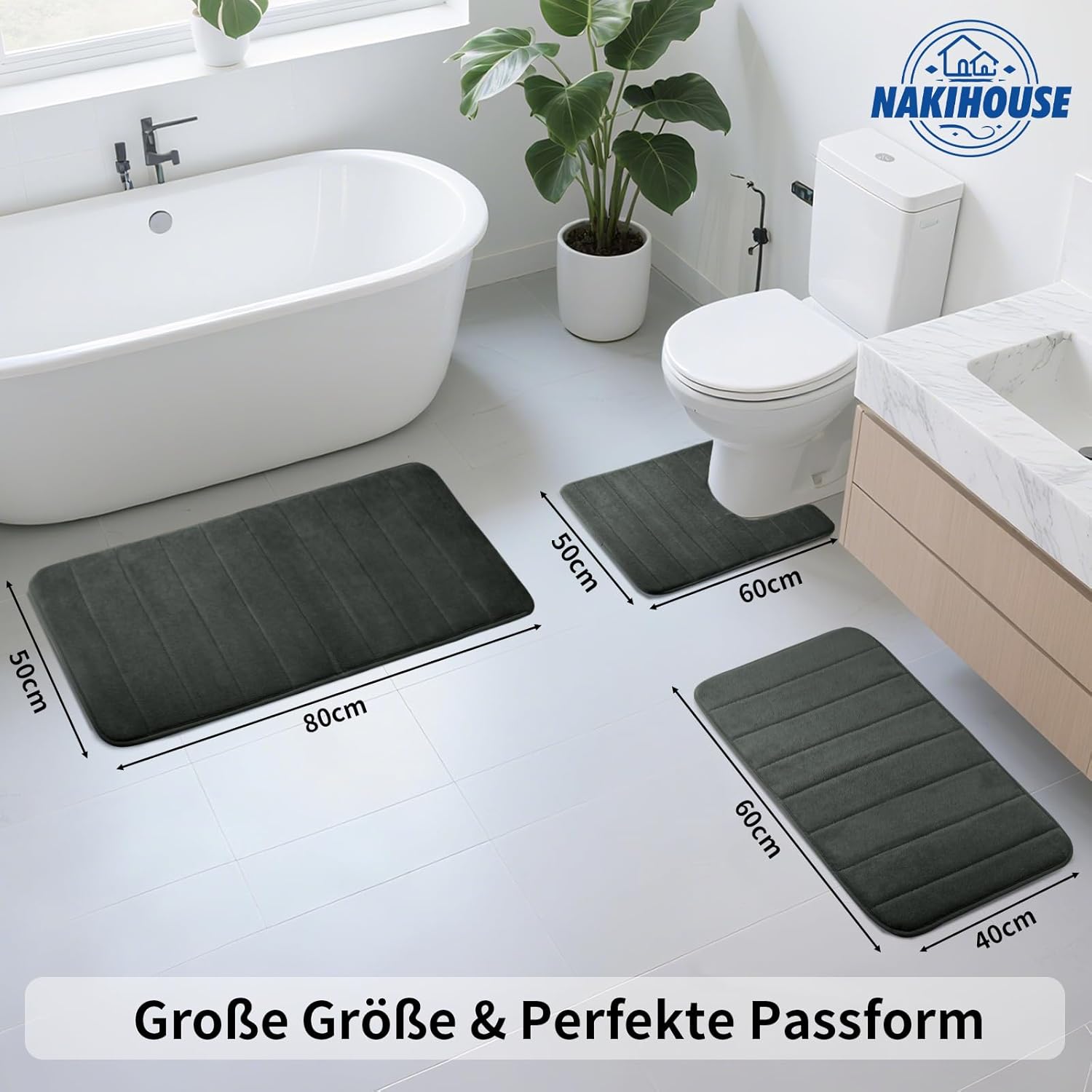 • Пълен комплект килими за баня: Нашият комплект от 3 килима за баня съдържа две килими за баня (80 x 50 см и 60 x 40 см) и U-образна тоалетна постелка (50 x 60 см) - идеална за всякакъв дизайн на банята. Пасва идеално като постелка за душ, тоалетна или класическа постелка за баня.