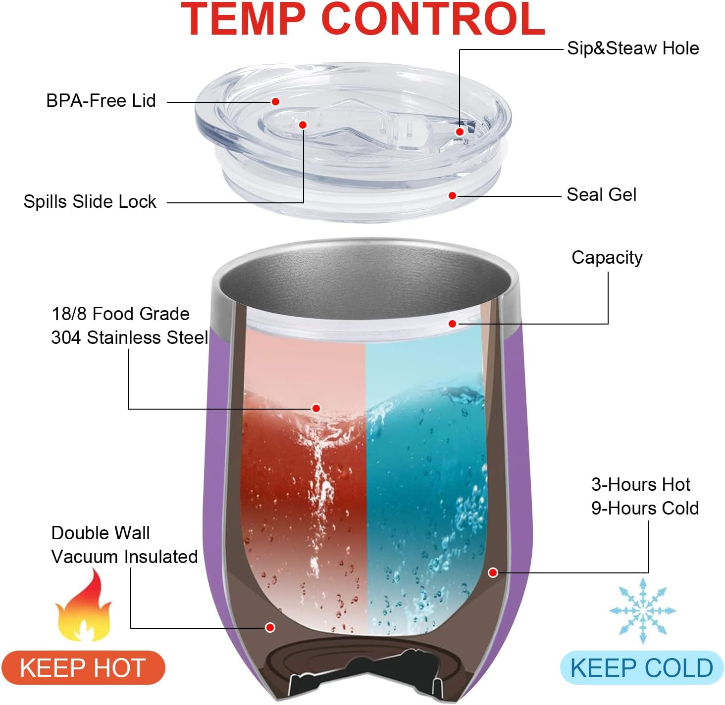 Die hervorragende Technologie hält Ihre Getränke bis zu 9 Stunden kalt und bis zu 3 Stunden heiß, für alle Arten von heißen und kalten Getränken wie Wein, Kaffee, Bier, Saft usw., hält Ihren Wein oder Kaffee auf der perfekten Temperatur.