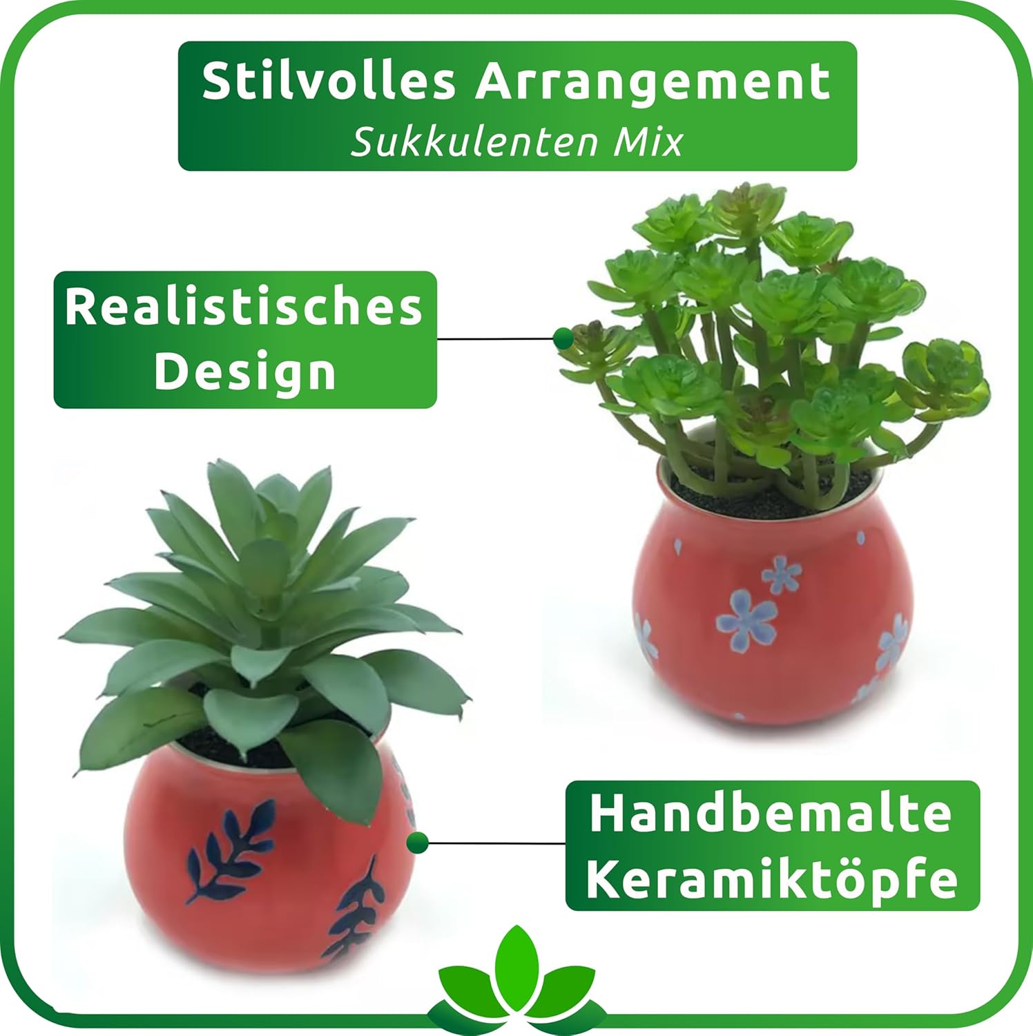 • Елегантни саксии – ние умишлено не използваме евтини пластмасови саксии с нашия комплект изкуствени растения, защото само това прави вашите изкуствени растения в саксията да изглеждат реалистични и декоративни. Матовият тон на саксиите хармонизира с естествените цветове на декорацията от изкуствени растения и по този начин създава естествена атмосфера.