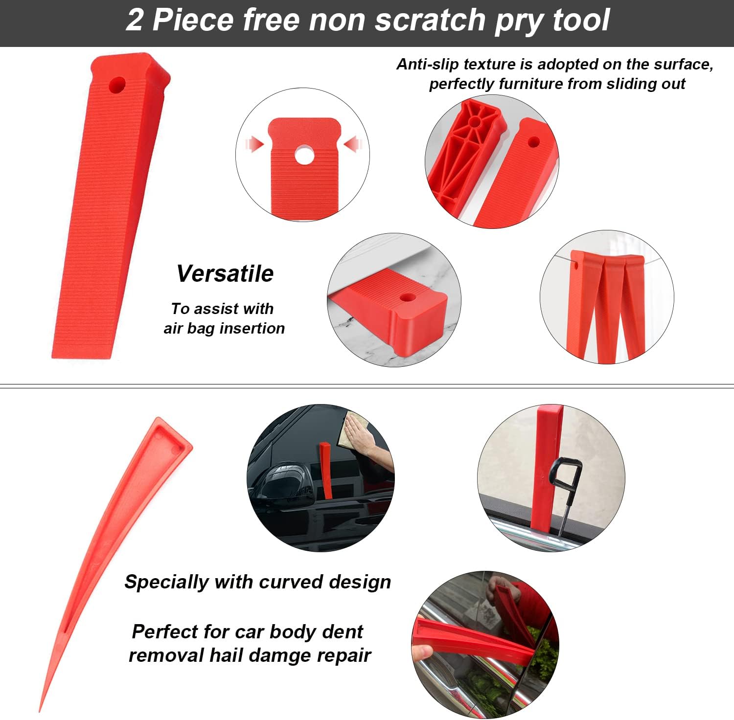 Rotes Hebelwerkzeug zur Unterstützung beim Einsetzen des Airbags. Diese Unterlegscheiben aus zuverlässigem PP-Material sind stark und haben eine gute Textur und werden nicht leicht beschädigt. Der gebogene Keil ist perfekt für die Reparatur von Schäden an der Karosserie. Und es wird auch häufig als Abstandshalter beim Einbau von Innentüren, Nivellieren von Möbeln, Fenstern und Türen, Küchengeräten usw. verwendet.
