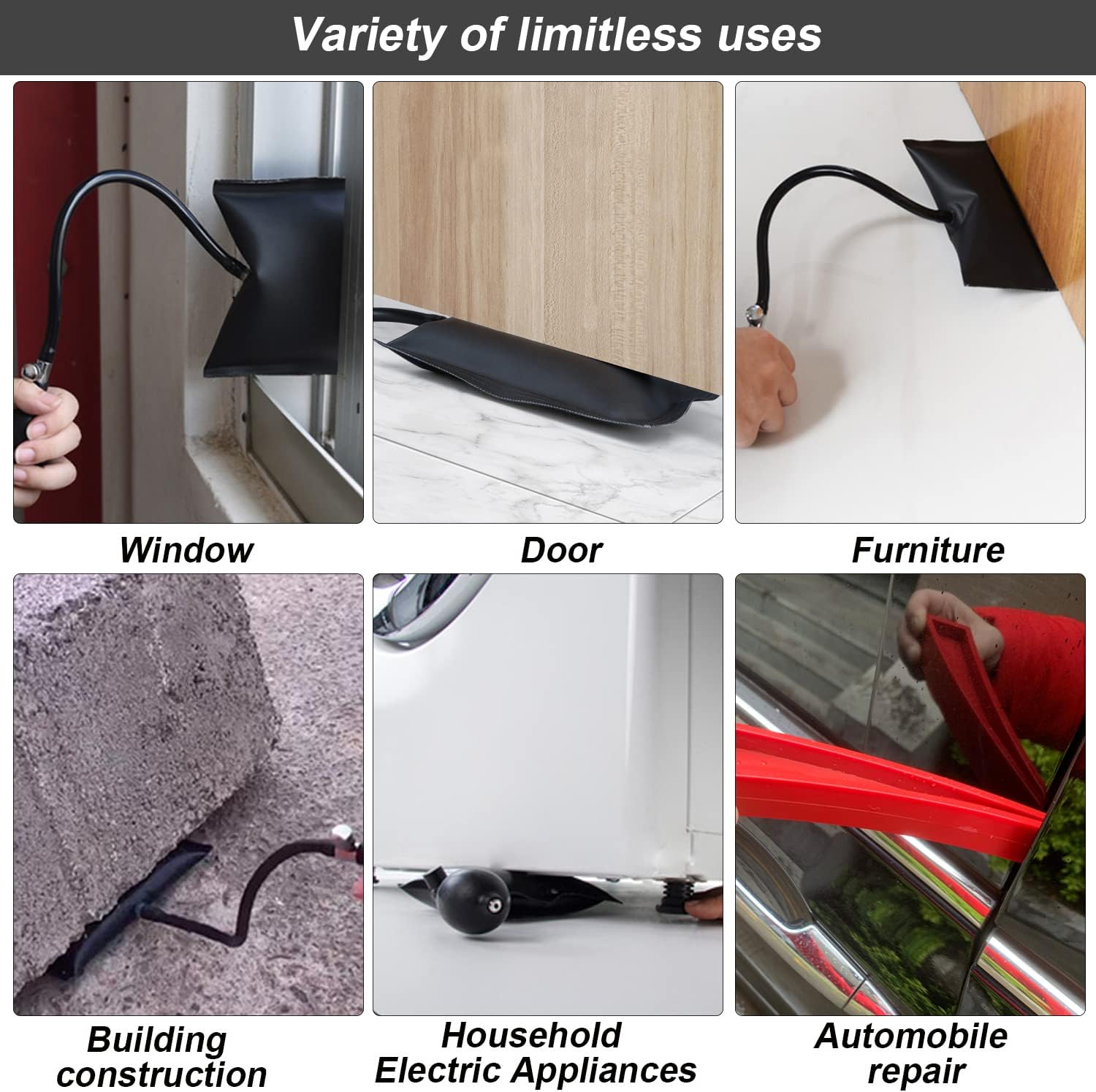 Нашите въздушни възглавници са идеални за разнообразни задачи и са подходящи за „Направи си сам“ проекти, повдигане на врати, автомобилни и шкафови инсталации. Могат да се използват за греди, шкафове, врати, електрически уреди, хладилници, мебели, климатици, бани, греди, плотове, камини, аксесоари за баня, прозорци и др.