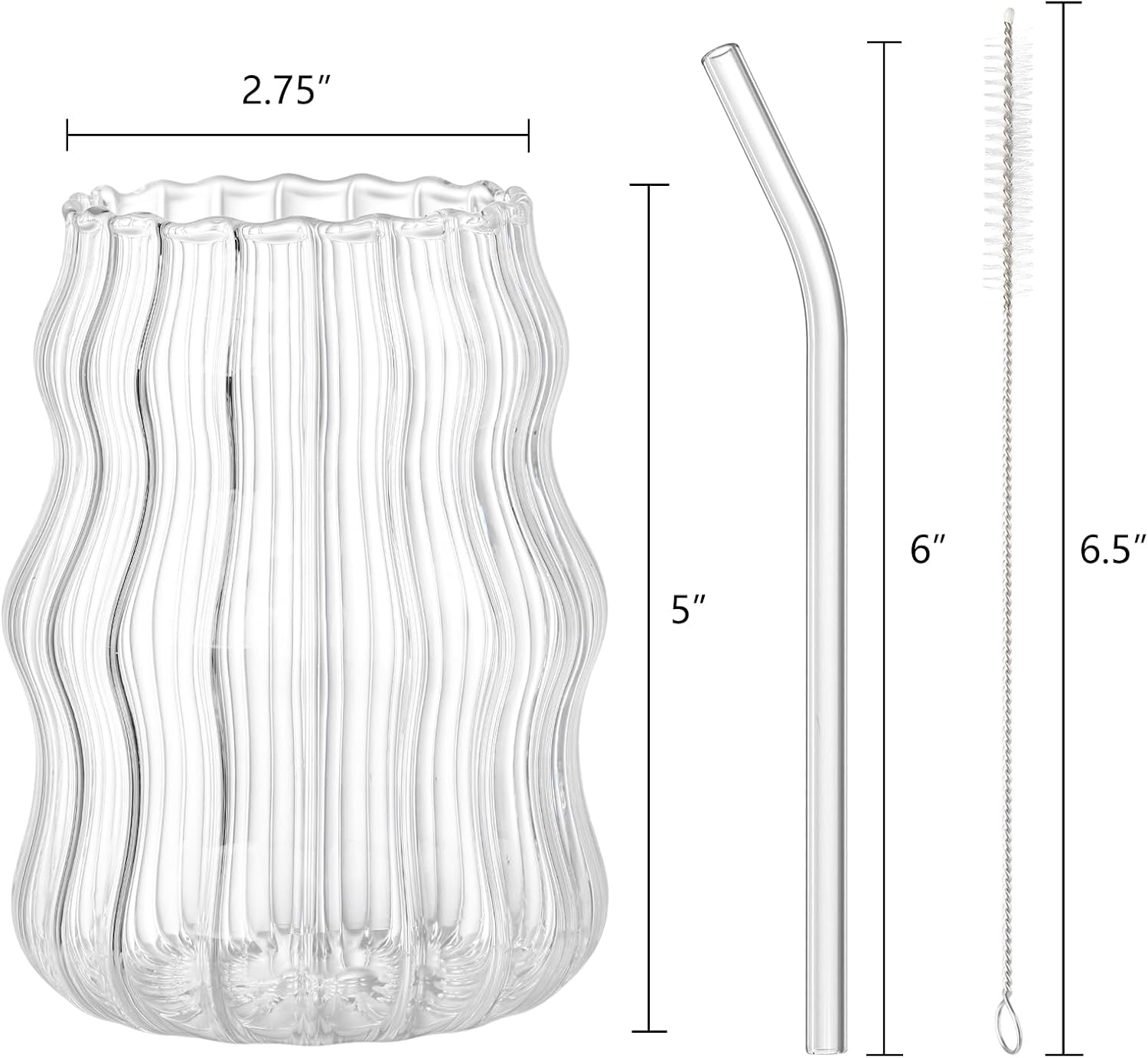 Комплект от 4 стъклени чаши Tebery със сламка от 480 мл, винтидж чаши за пиене от 16 унции, чаши за коктейли с вълнообразен дизайн за ледено кафе, сок, напитки, мляко