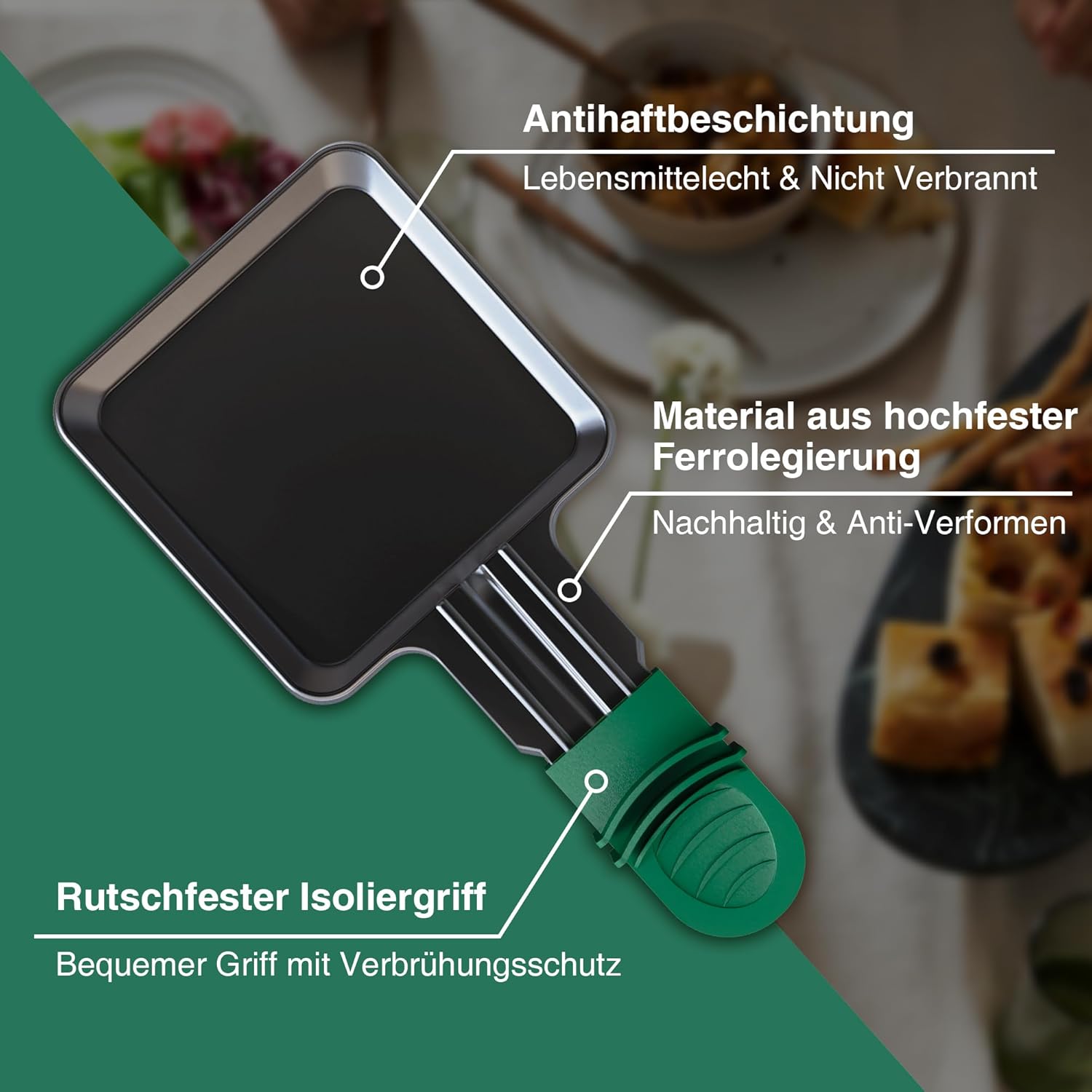 • Премиум качество: мини тиган за раклет, изработен от висококачествен материал, здрав и издръжлив, незалепващ и безопасен за храна. Включената лопатка е изработена от найлон, безопасна, нетоксична и за многократна употреба.