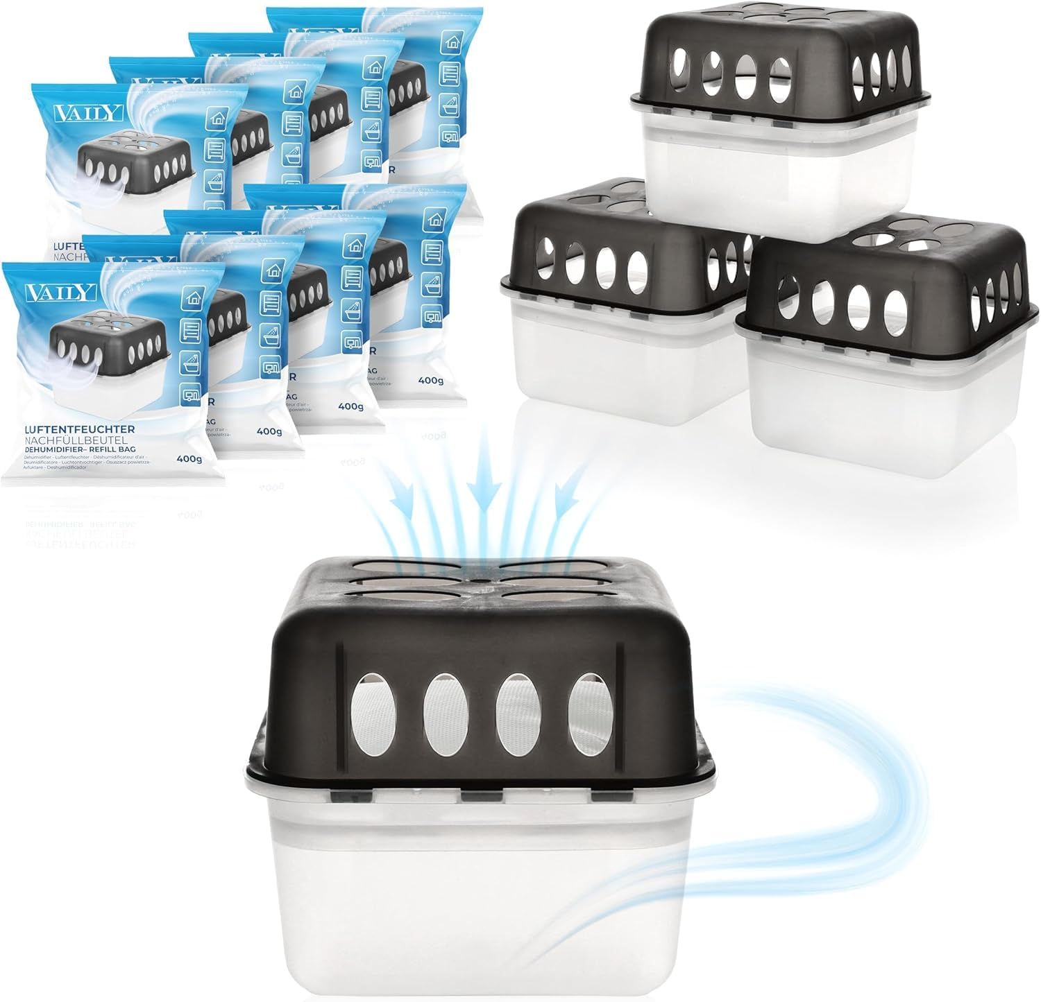 Комплект от 4 влагоабсорбатора Vaily с 8 торбички за пълнене x 400 г - Влагоабсорбатор с гранули за баня, мазе, дом и много други до 40 м²