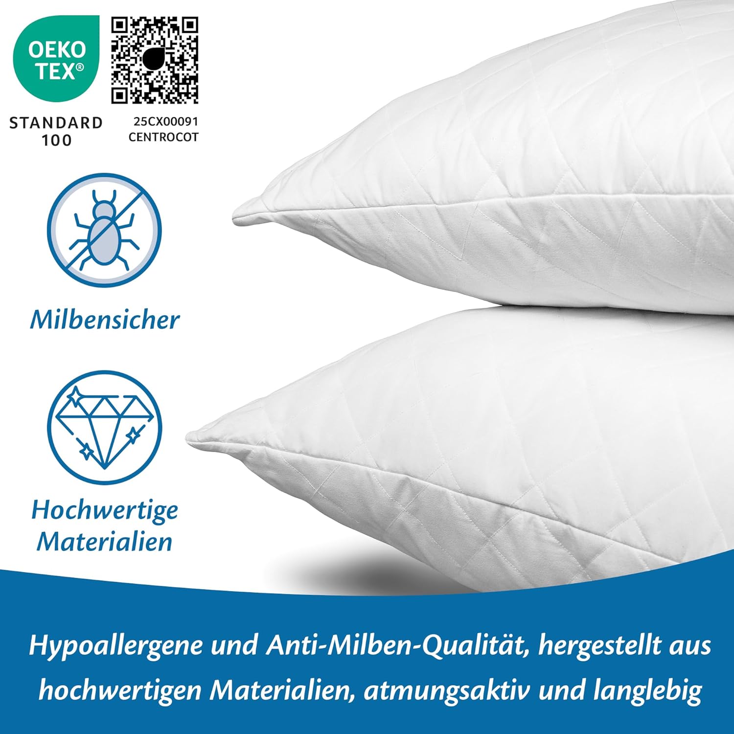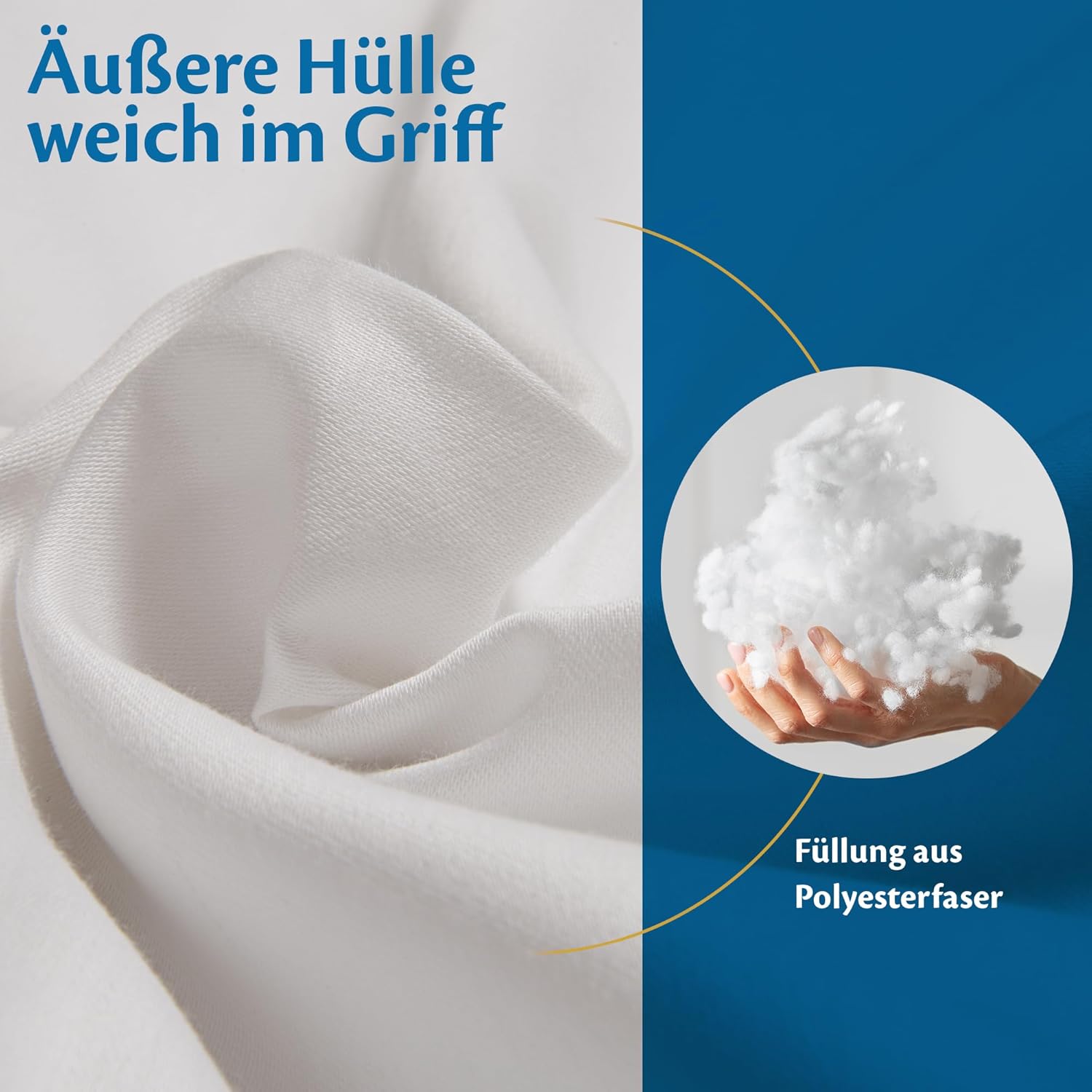 • Висококачественото външно покритие от бял полипамук е хипоалергенно и дишащо. Вътрешната подплата, изработена от полиестерни влакна със силиконово покритие, запазва формата си и осигурява на тялото ви оптимална опора. Това също така прави възглавниците хипоалергенни и антиакари.