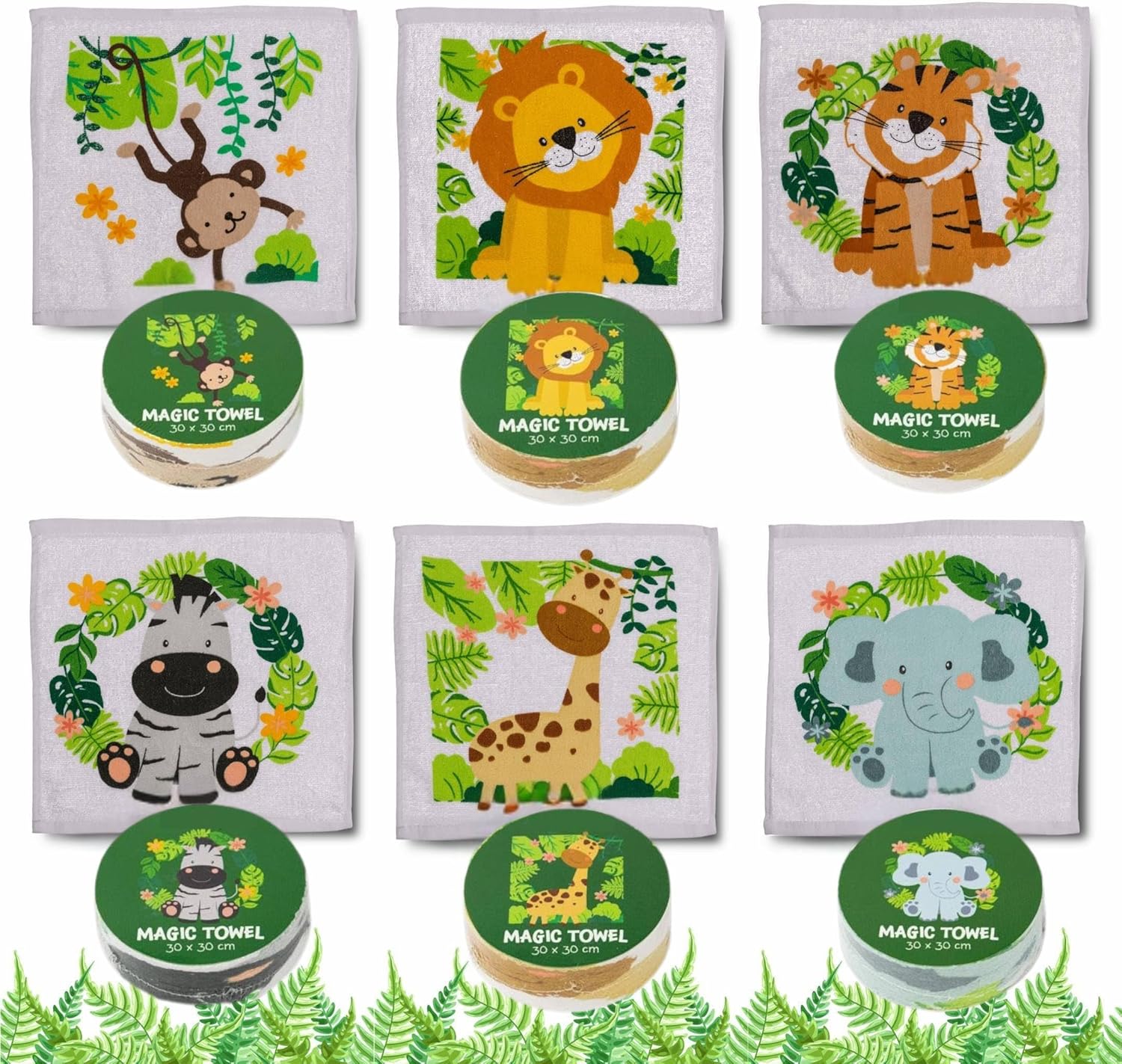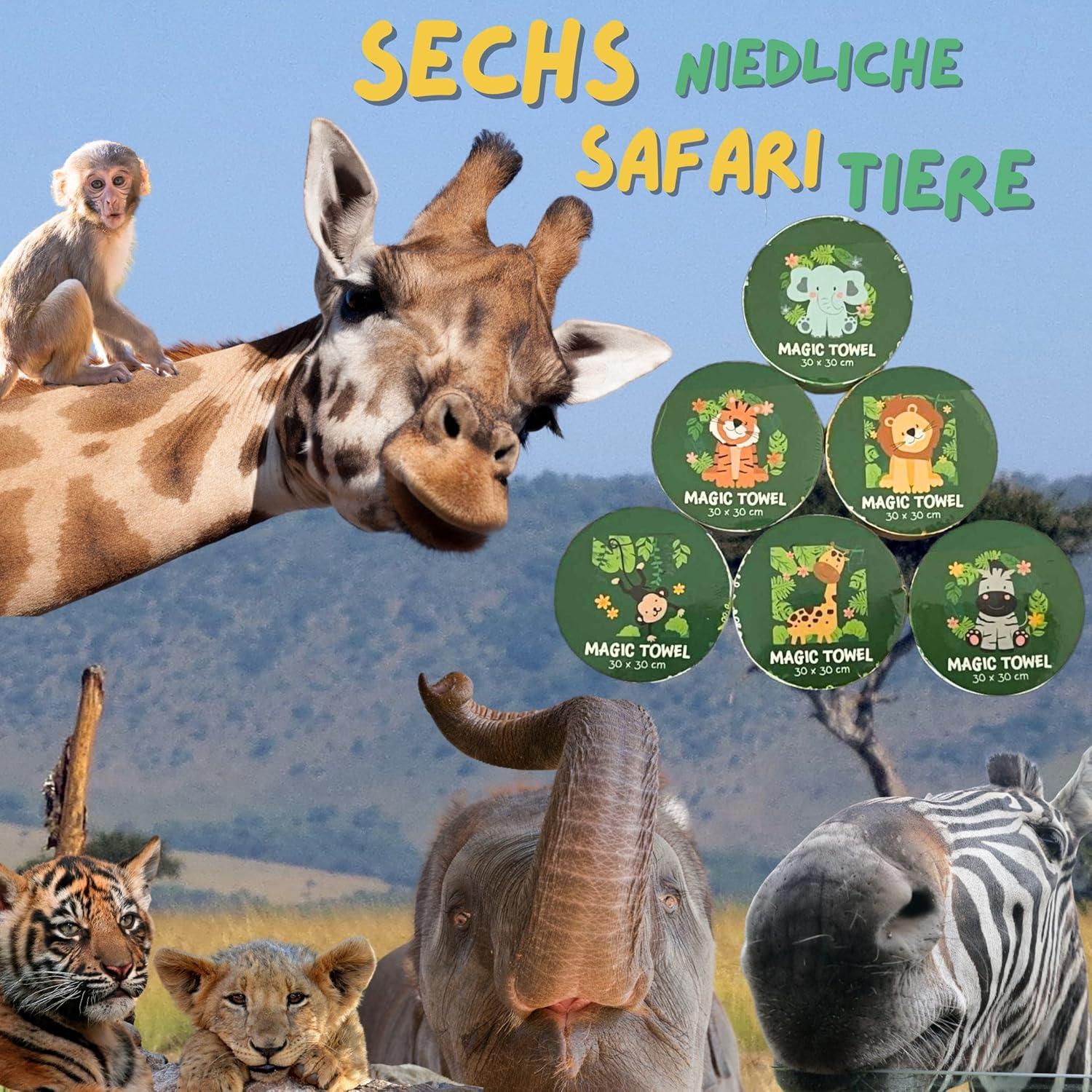 Ще получите комплект от 6 магически кърпи в шест различни дизайна на сафари животни. Обикновено получавате жираф, маймуна, слон, тигър, зебра и лъв.