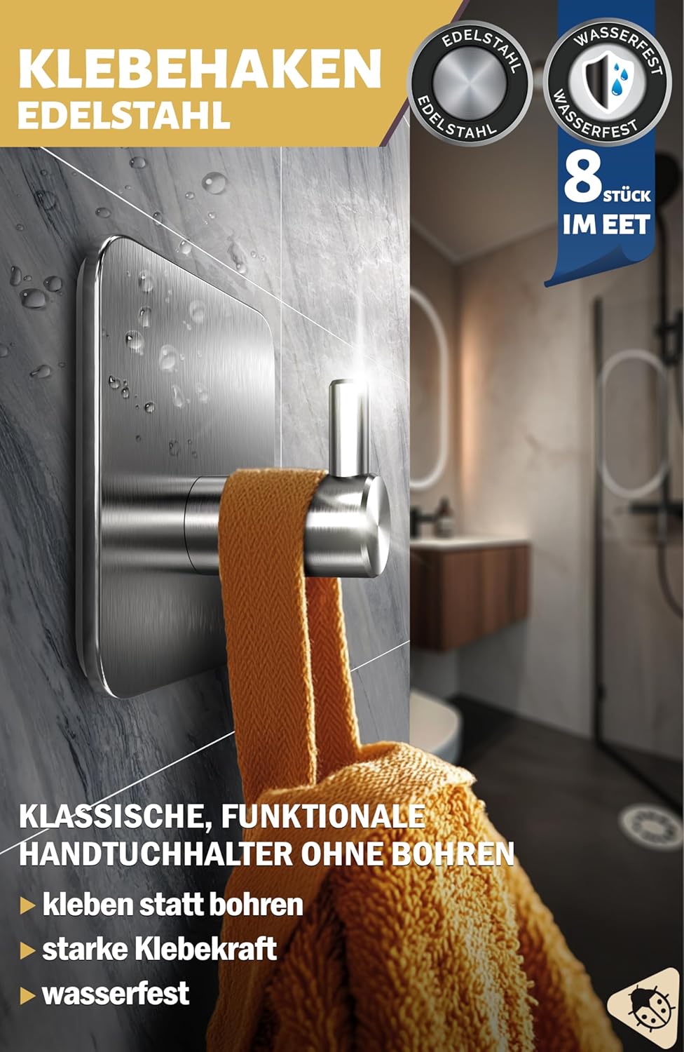 • Солидно качество: висококачествени самозалепващи се куки за кърпи, изработени от неръждаема стомана V2A с двойна защита от ръжда; лесни за почистване – ексклузивни аксесоари за баня за дълготрайно удоволствие