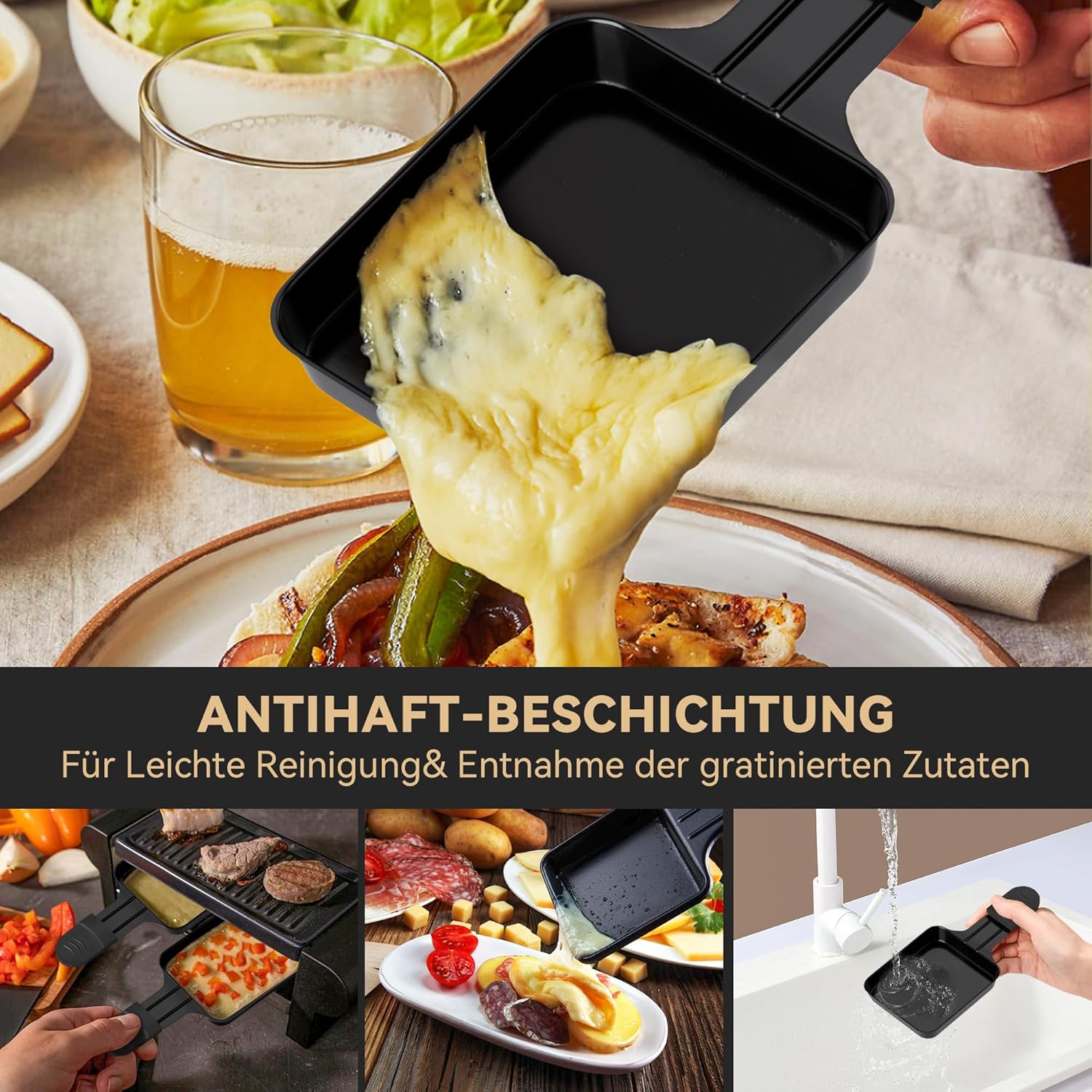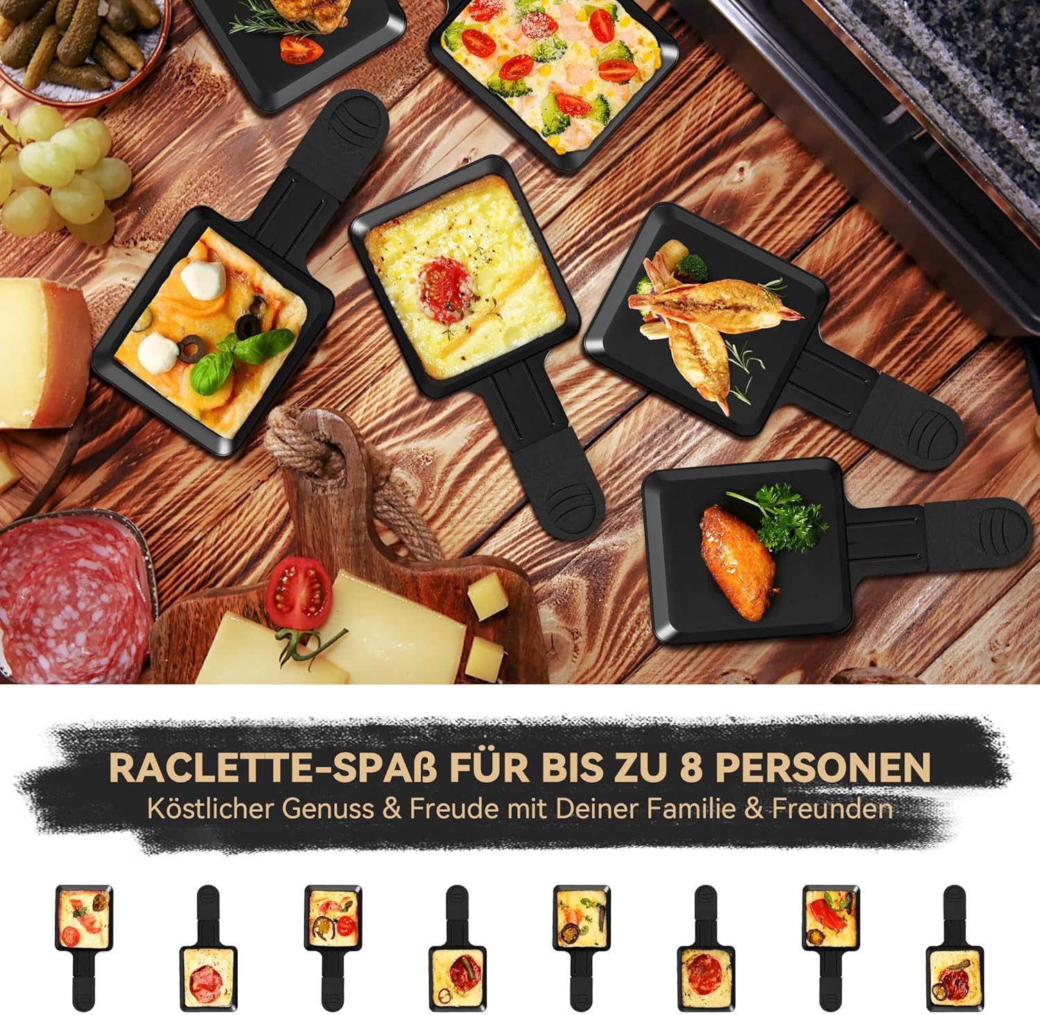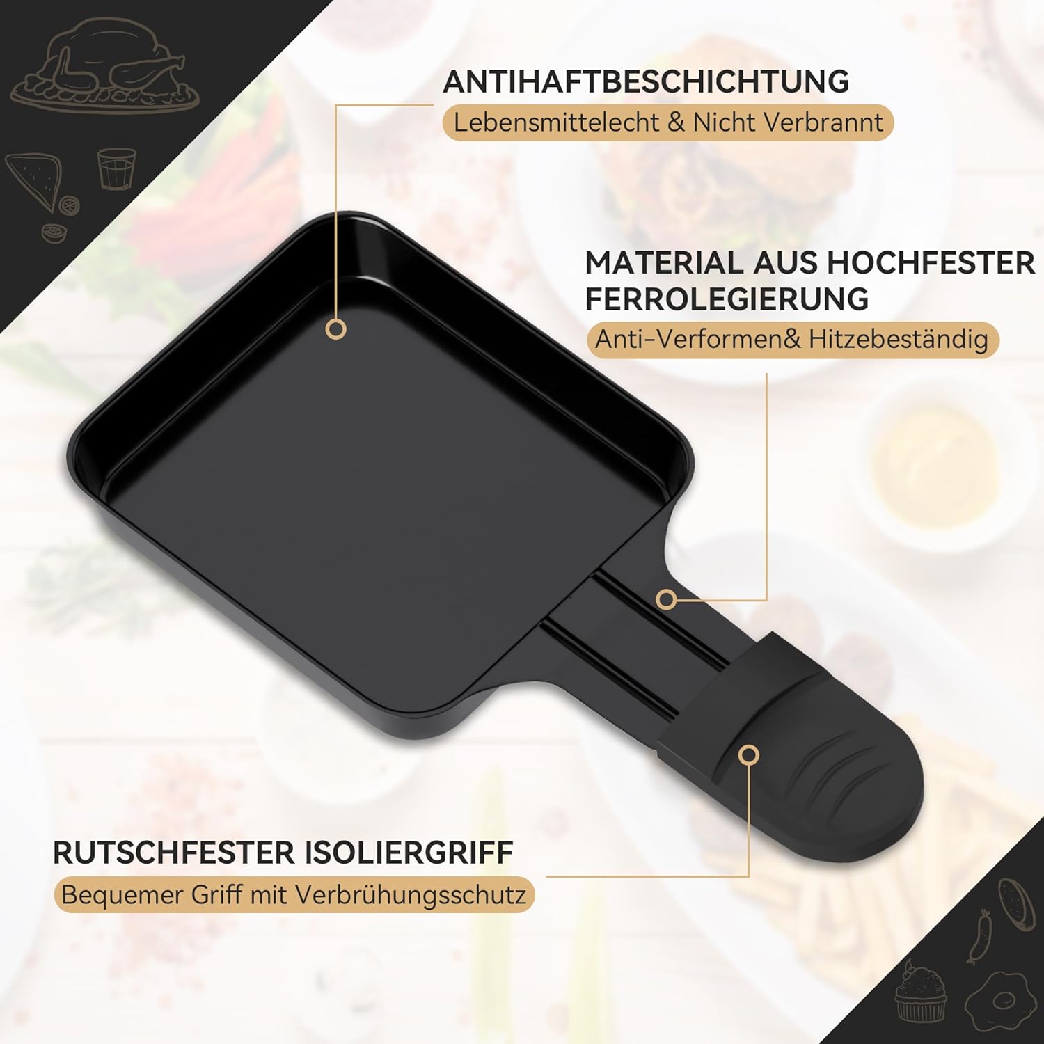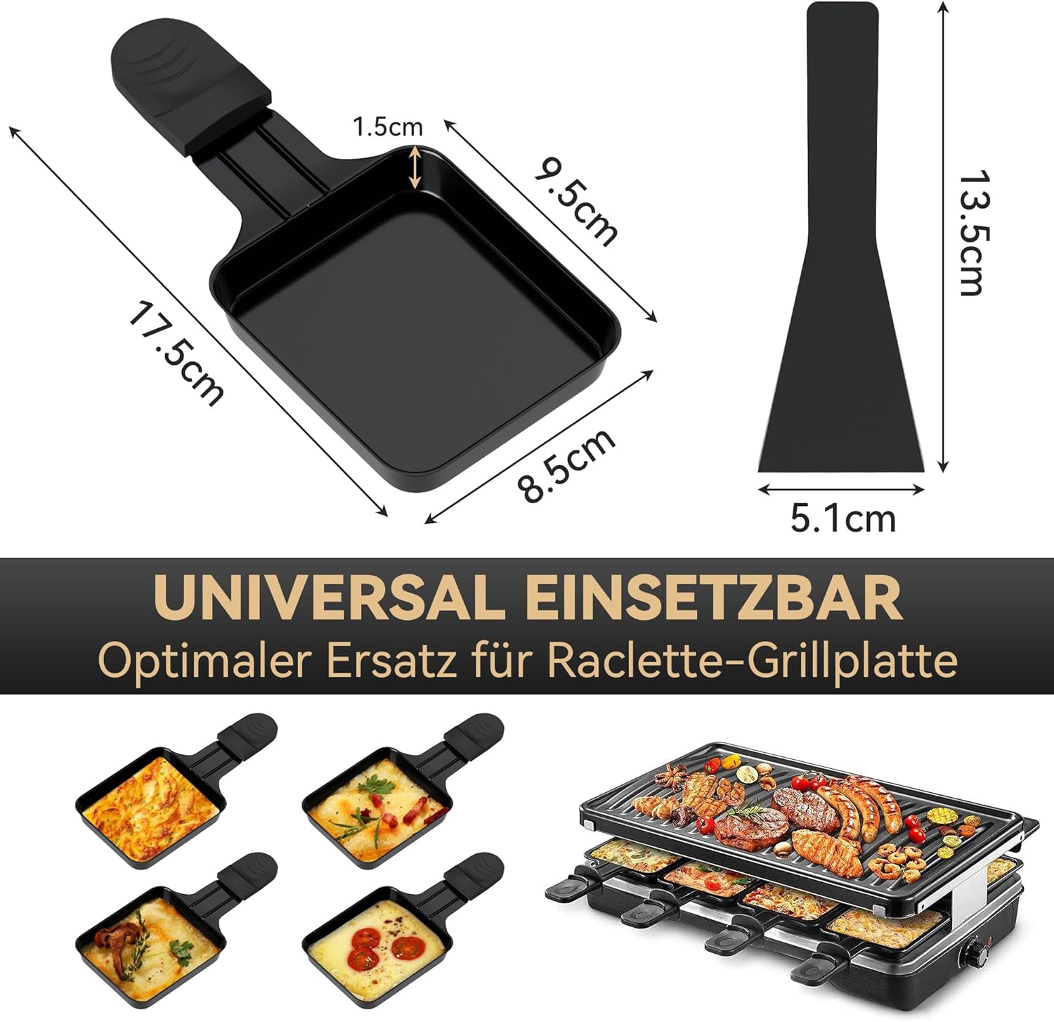 • Перфектен комплект: универсални тигани за раклет в комплект от 8 броя с 8 лъжички, подходящи за повечето раклет скари, квадратна форма, модерен дизайн.