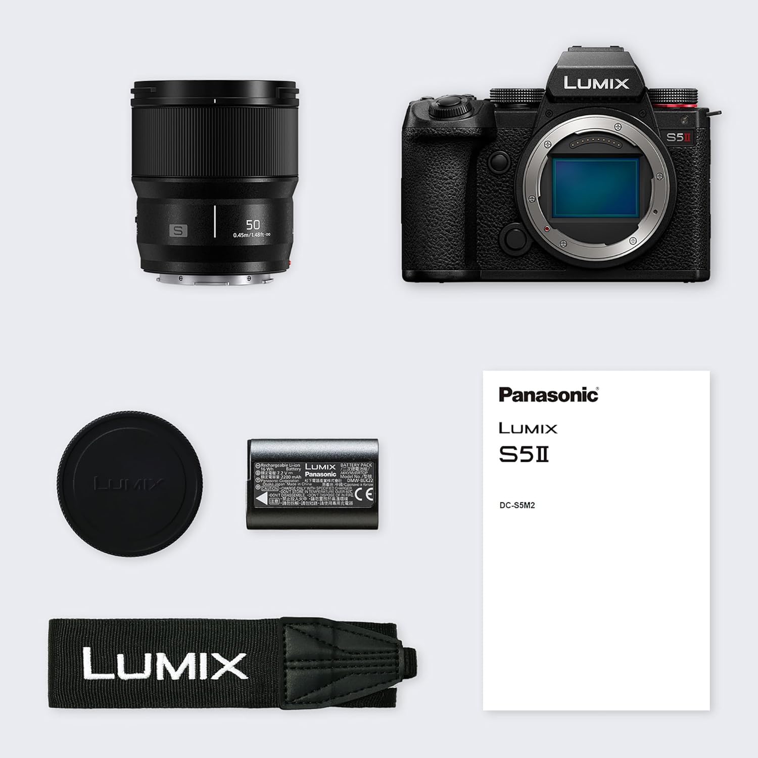 Комплект Panasonic LUMIX S5II пълноформатен безогледален фотоапарат с нов фазов хибриден автофокус, активна стабилизация на изображението, неограничен 4:2:2 10-битов запис, 4K 60p и 6K 30p с обектив LUMIX 50 mm F1.8 L-Mount - DC-S5M2CE