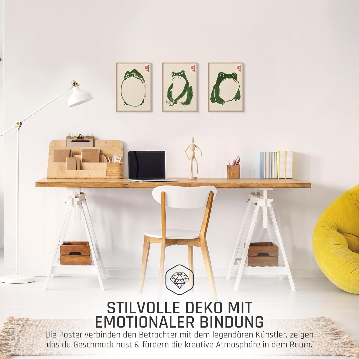 Потопете се в сливането на изкуство, време и технологии с нашия ексклузивен комплект плакати от 3 висококачествени плаката DIN A4. Всеки плакат е с емблематични произведения на изкуството от известния японски художник Мацумото Ходжи. Сложна дигитална реставрация вдъхва нов живот на произведенията на изкуството и създава уникален висококачествен вид. ВЪЗПОЛЗВАЙТЕ СЕ ОТ ПРЕДИМСТВАТА: Впечатляващ визуален шедьовър в комплекта: всеки плакат с жабешко изкуство е завладяващо произведение на изкуството в стил Укийо-е, което улавя детайлите и емоциите на художника и сега е представено в нов, впечатляващ вид. Тези плакати Укийо-е са резултат от най-новите технологии и вечната творческа изразителност. Те предлагат визуално изживяване, което е несравнимо. Естетическа история на изкуството: Вземете парче от историята на изкуството от Япония и създайте специална връзка с нея. Висококачествени материали, живи цветове: нашите плакати са отпечатани върху първокласна хартия, за да гарантират дълготрайно удоволствие. Брилянтните цветове и острите като бръснач детайли правят произведенията на изкуството да оживеят. ВДЪХНОВЕНИЕ ЗА КРЕАТИВНИ ЛИЦА Тези произведения на изкуството могат да бъдат източник на вдъхновение за вашите собствени проекти. Те създават творческа атмосфера, която стимулира творчеството. Вдъхнете живот на стаите си с тези уникални плакати и се насладете на вечната връзка между изкуството и технологиите. Вземете своя комплект японски плакати сега и се вдъхновете от сливането на изкуството и технологиите.