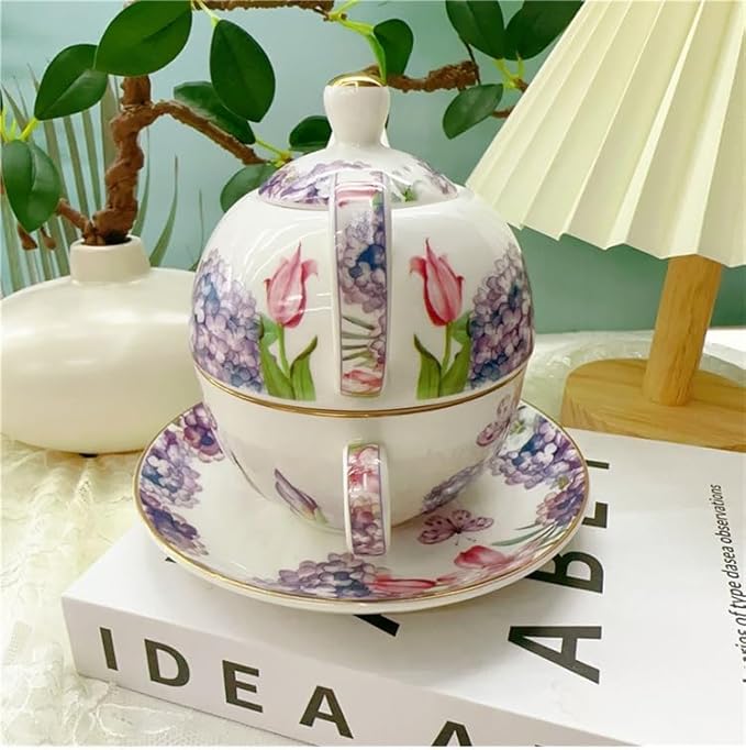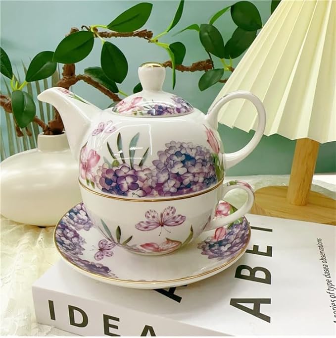 Комплект порцеланов чай ​​за един човек, красив керамичен чайник с цвете и чаша, подаръчна кутия (хортензия)