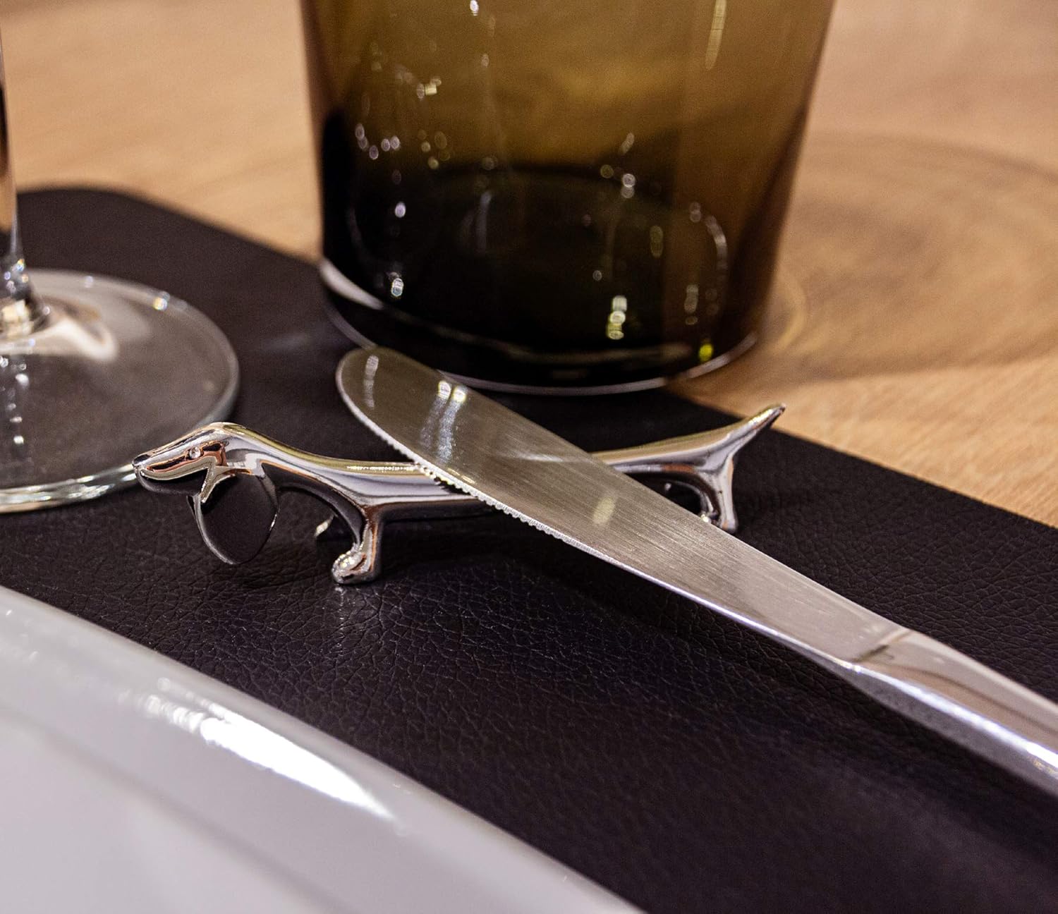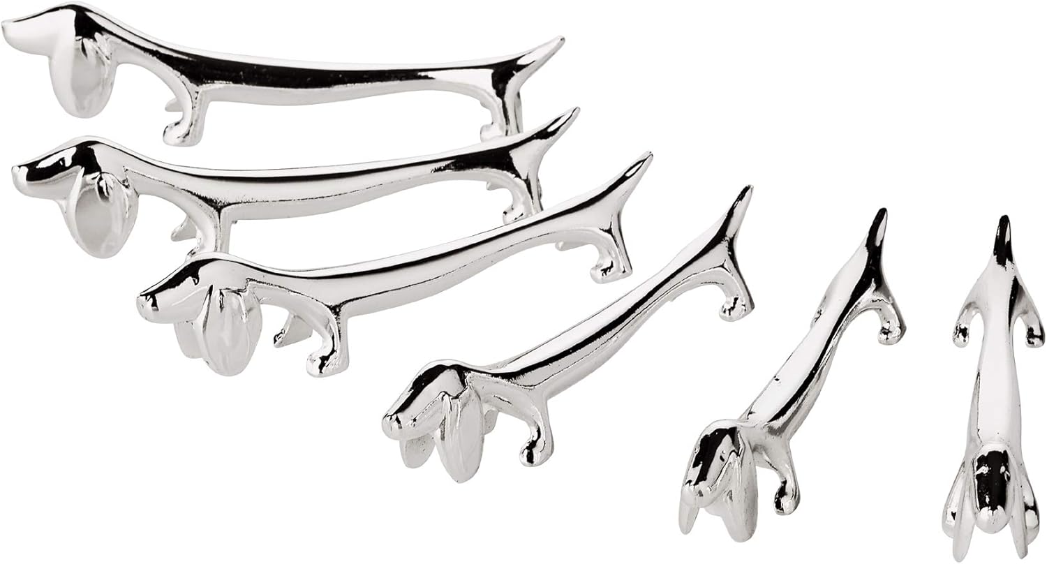 • ФУНКЦИОНАЛНОСТ СЪС СТИЛ: Посребрената поставка за ножове във формата на куче съчетава функционалност и елегантност. Тя служи като държач за прибори за хранене за ножове, вилици, лъжици и клечки, гарантирайки, че приборите ви се съхраняват стилно и хигиенично.