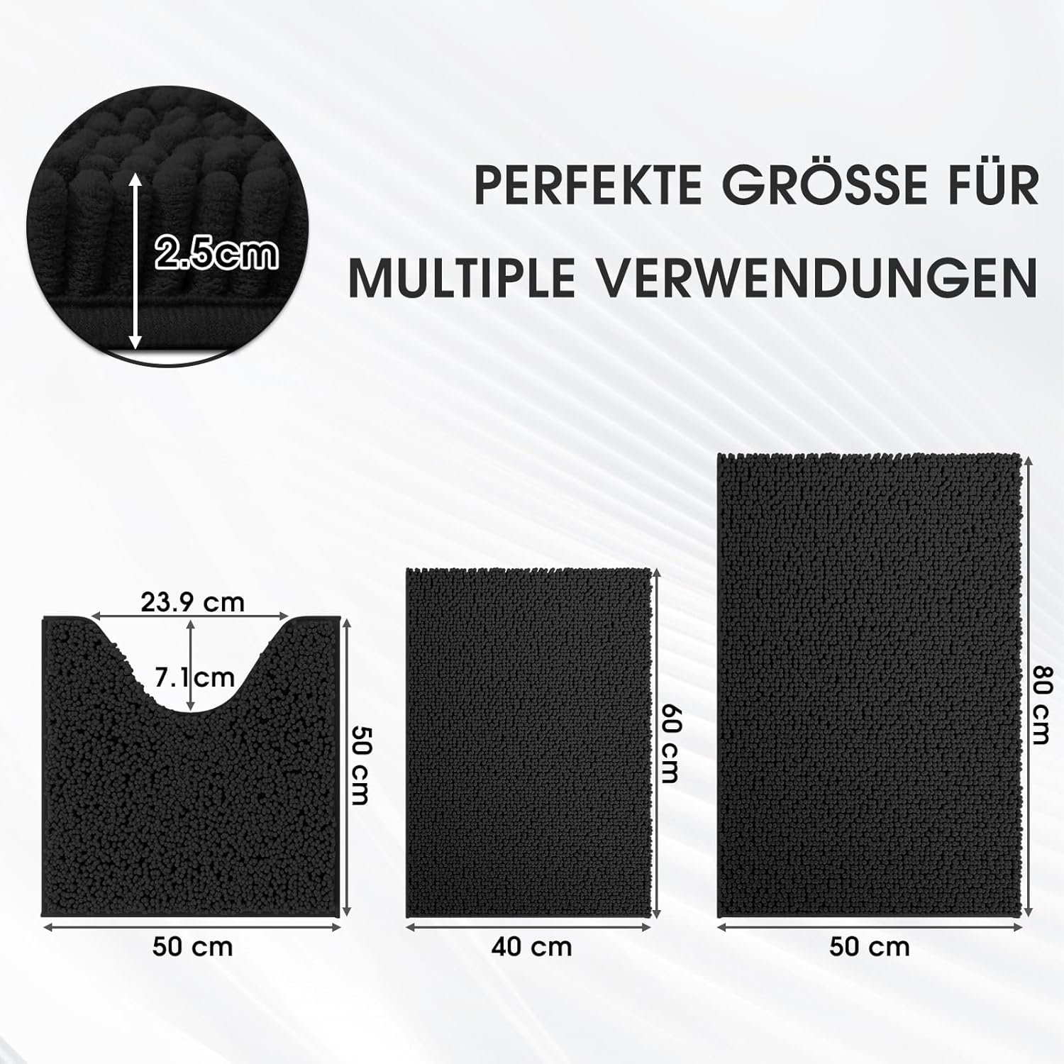 Комплект постелки за баня, Комплект от 3 меки постелки за баня с неплъзгащо покритие, Комплект абсорбиращи постелки за баня от шенил за баня, тоалетна и душ, Може да се пере в пералня, Черен