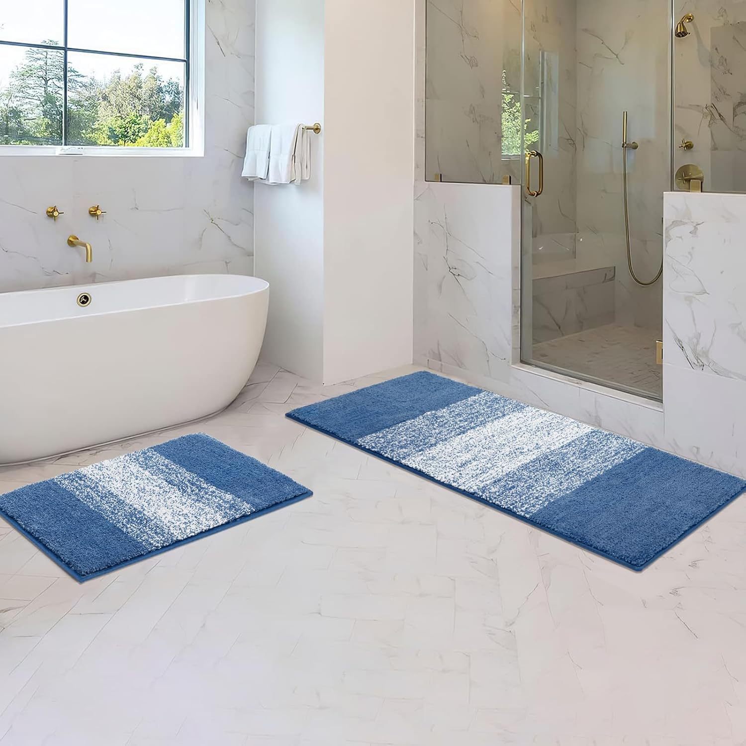Комплект постелки за баня от микрофибър, 2 части, син, неплъзгащ се, абсорбиращ, мек килим за баня, постелка за тоалетна, може да се пере в пералня, комплект килими за баня, килим за тоалетна, 45 x 65 см + 45 x 120 см