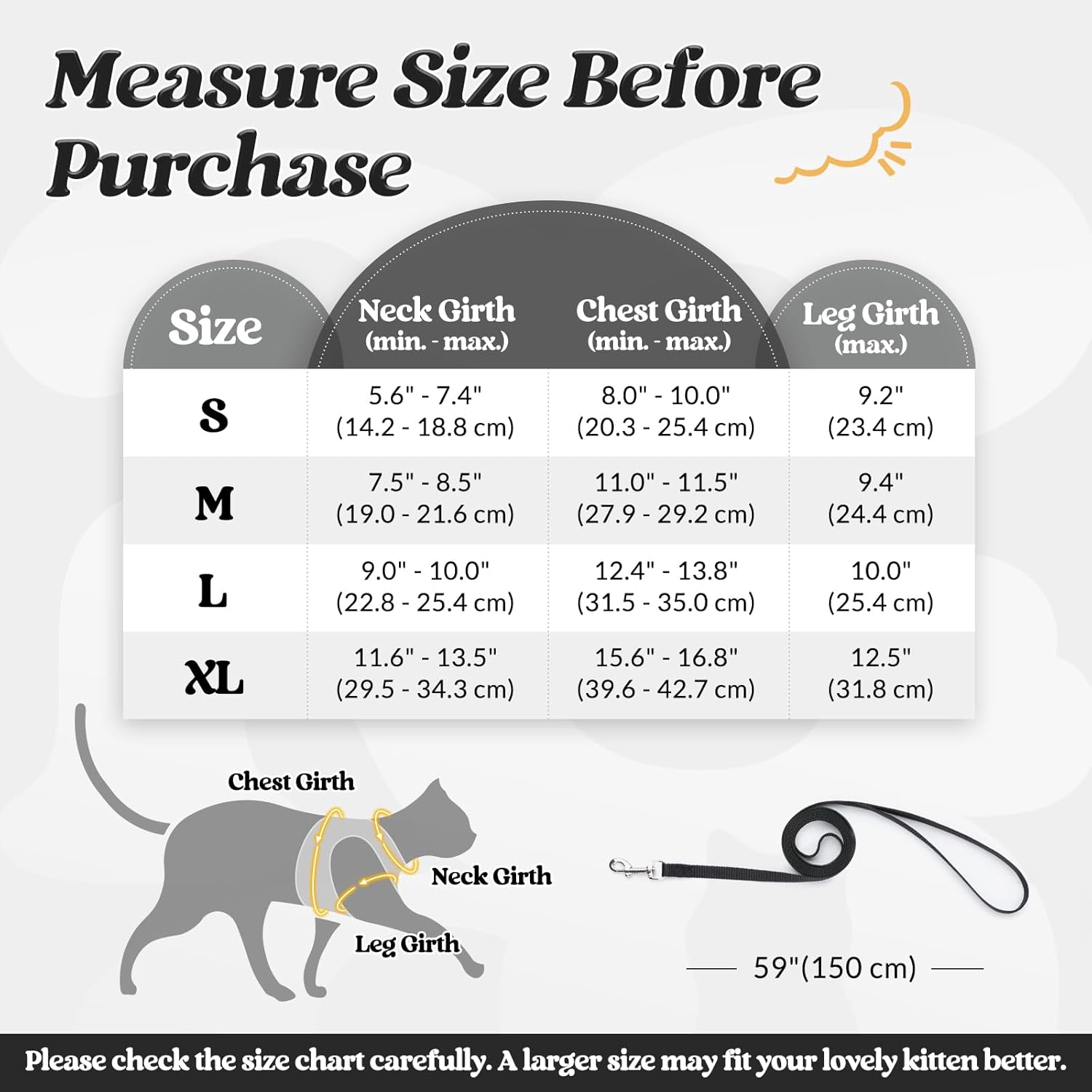 ПАСВА ПЕРФЕКТНО ЗА ВРАТА 17-21 СМ ГЪРДЕН КРЪГ 23-28 СМ Моля, измерете точно котката си и внимателно изберете нагръдник според таблицата с размери. За по-добро прилягане на вашето очарователно котенце се препоръчва да изберете по-голям размер. Комплектът включва: 1 x нагръдник за котки и 1 x найлонова каишка (149,9 см). Създаден за комфорт и функционалност, дизайнът на жилетката прави този нагръдник лесен за поставяне и сваляне. А регулируемата каишка създава перфектно прилягане за вашата котка с известно пространство за растеж. (Съвети: моля, дайте на котката си известно време да се запознае с този нагръдник за първи път)
