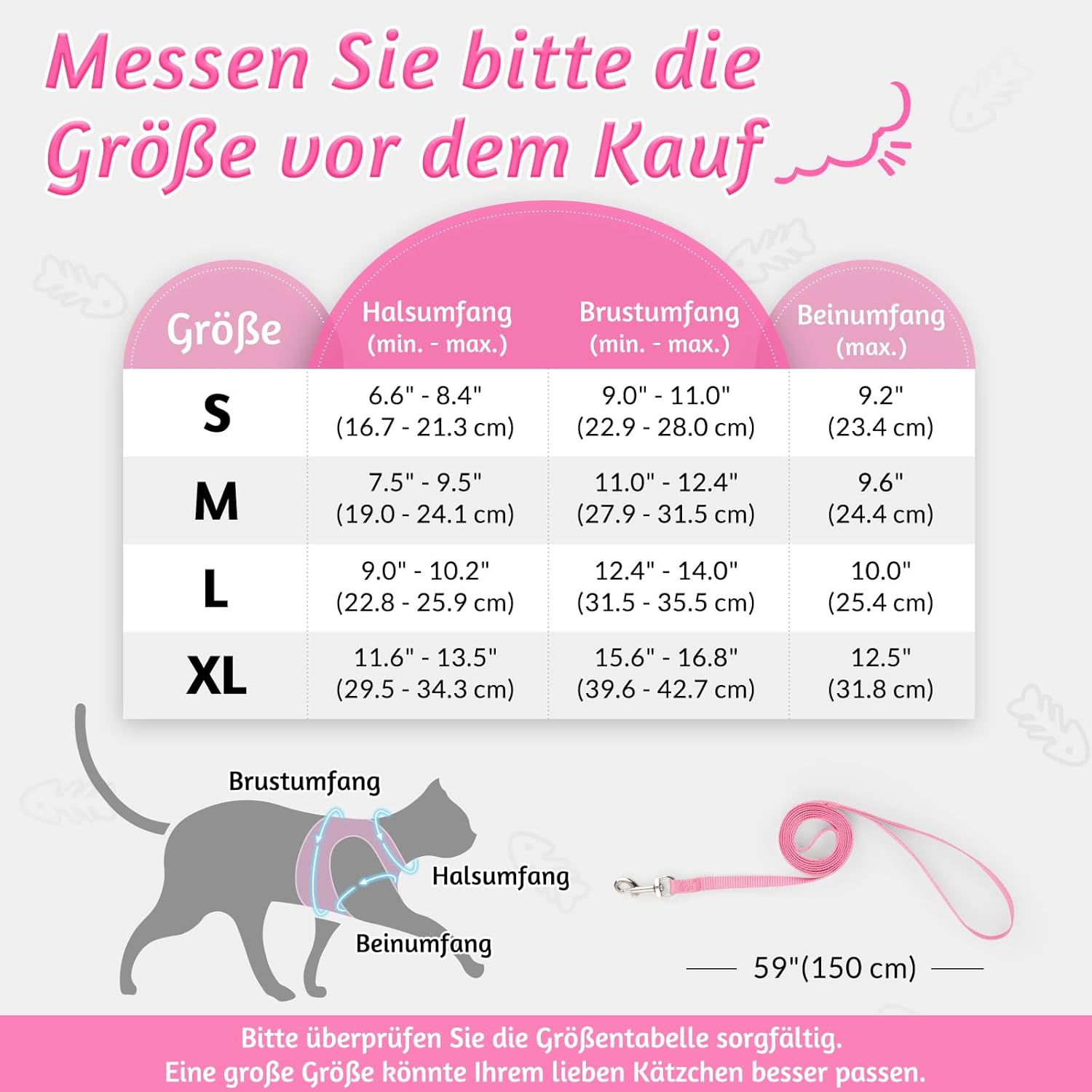 ПАСВА ПЕРФЕКТНО ЗА ВРАТА 17-21 СМ ГЪРДЕН КРЪГ 23-28 СМ Моля, измерете точно котката си и внимателно изберете нагръдник според таблицата с размери. За по-добро прилягане на вашето очарователно котенце се препоръчва да изберете по-голям размер. Комплектът включва: 1 x нагръдник за котки и 1 x найлонова каишка (149,9 см). Създаден за комфорт и функционалност, дизайнът на жилетката прави този нагръдник лесен за поставяне и сваляне. А регулируемата каишка създава перфектно прилягане за вашата котка с известно пространство за растеж. (Съвети: моля, дайте на котката си известно време да се запознае с този нагръдник за първи път)