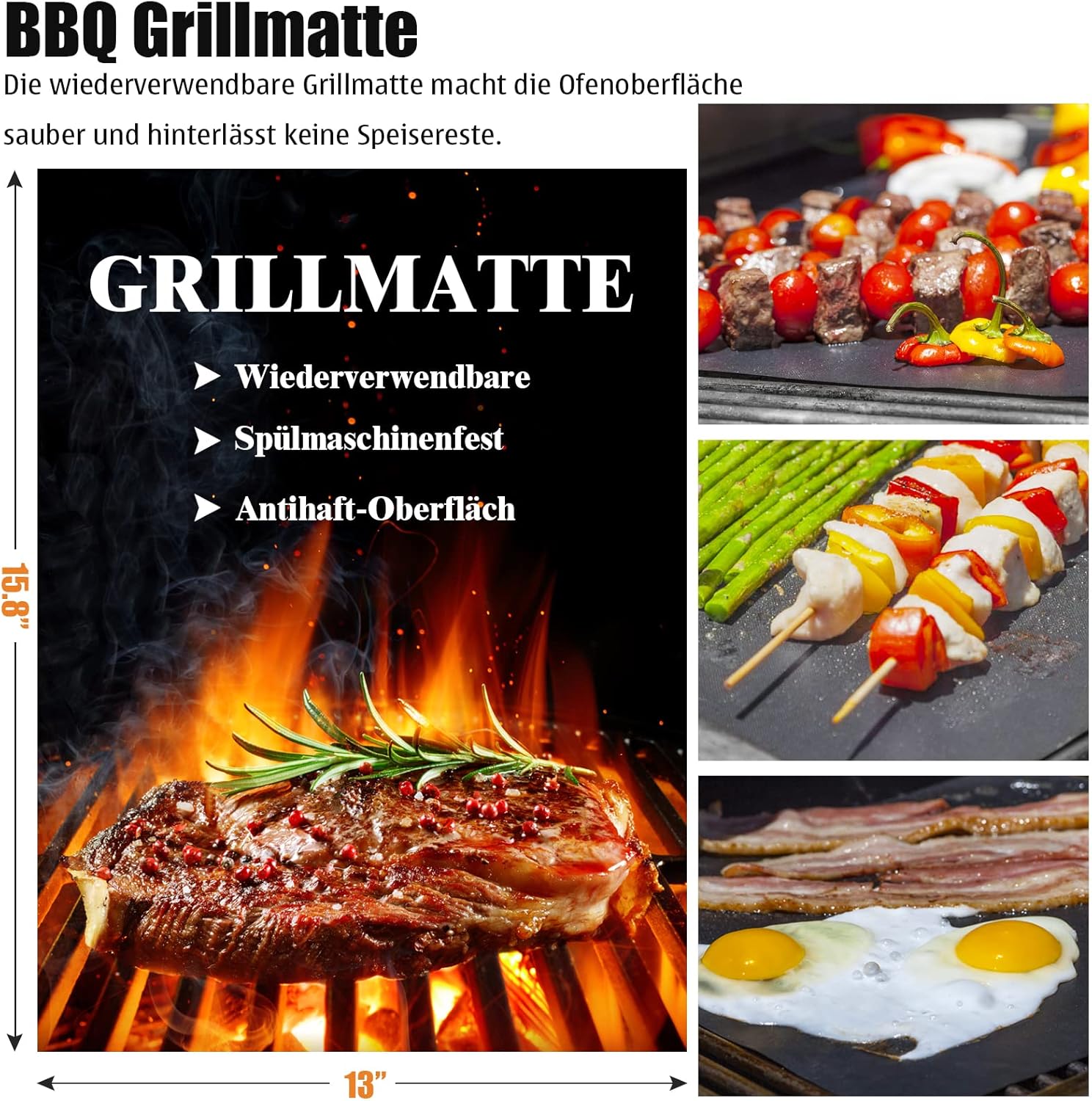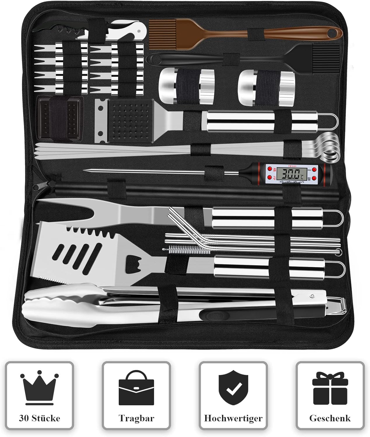 • Комплект прибори за барбекю грил: този комплект за барбекю грил съдържа всичко необходимо за перфектно барбекю, 30 броя аксесоари за барбекю, включително: 1 x шпатула за грил, 1 x щипки за барбекю, 1 x вилица за грил, 1 x четка за почистване на грил + 1 x допълнителна глава за четка, 1 x термометър за месо, 1 x подложка за грил, 1 x тирбушон за вино, 2 x четки за масло, 2 x бутилки за подправки, 4×Sp8 x държача за царевица, 1 x комплект сламки (съдържа 4 x сламки за многократна употреба + 1 x четка за почистване), 1 x чанта за носене