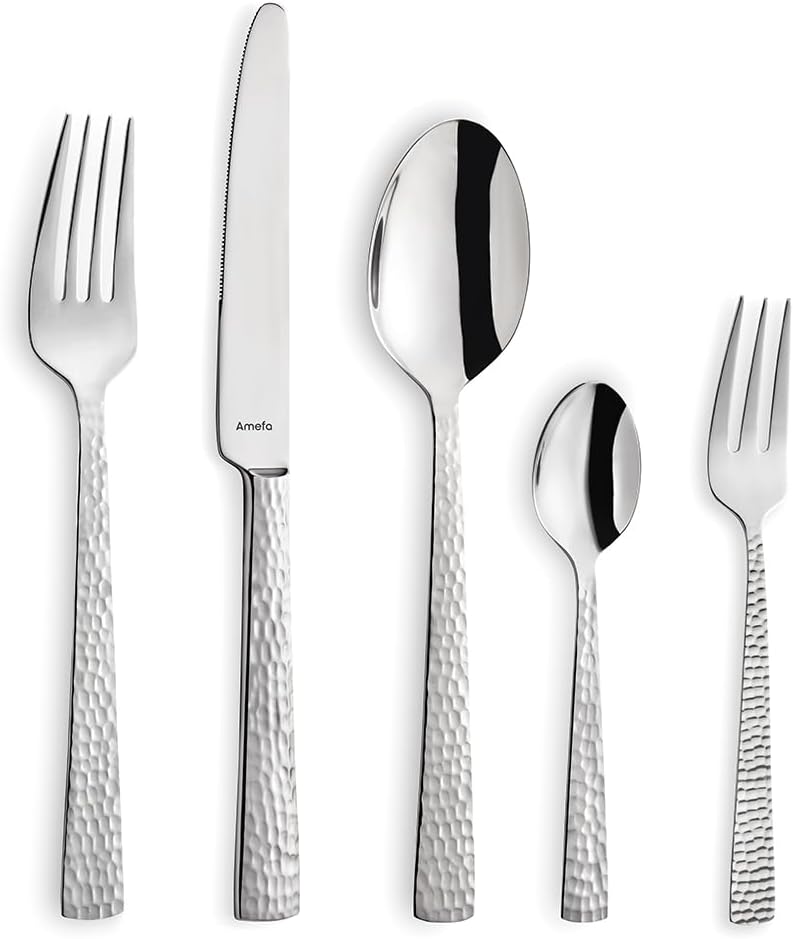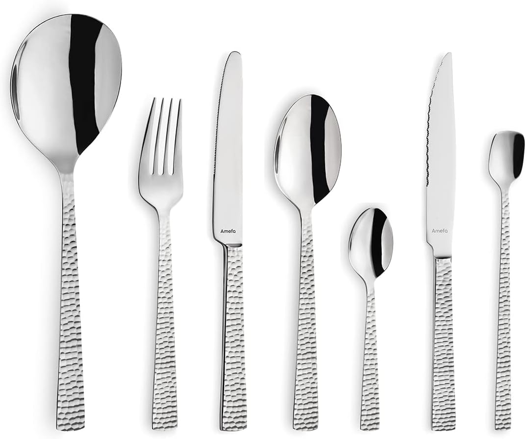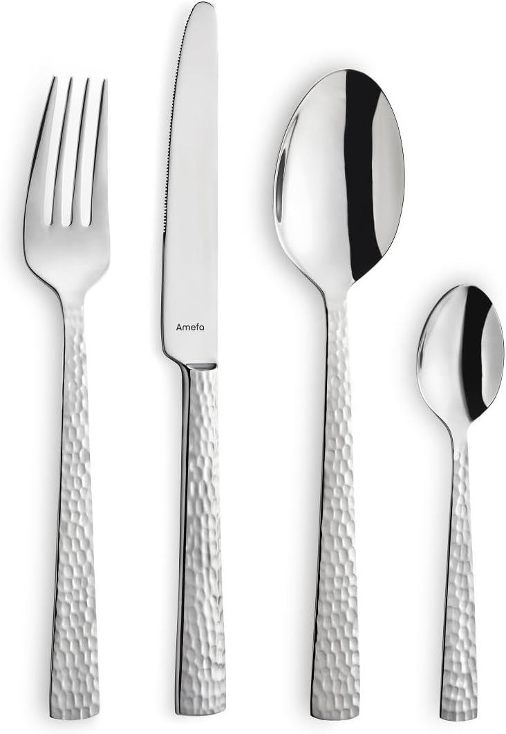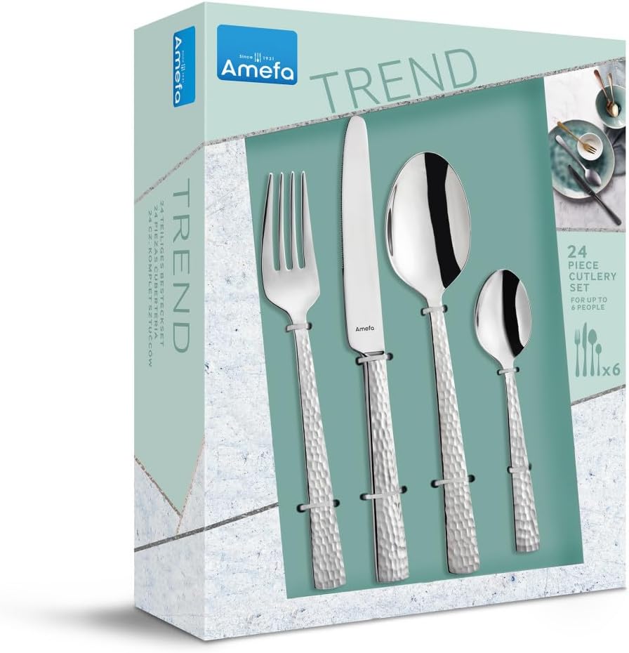 Комплект прибори за хранене Amefa Felicity, 24-частичен комплект прибори за хранене, комплект прибори за хранене за 6 души, неръждаема стомана 18/0, острие от стомана 13/0, кована дръжка, с нож, вилица, лъжица и чаена лъжичка