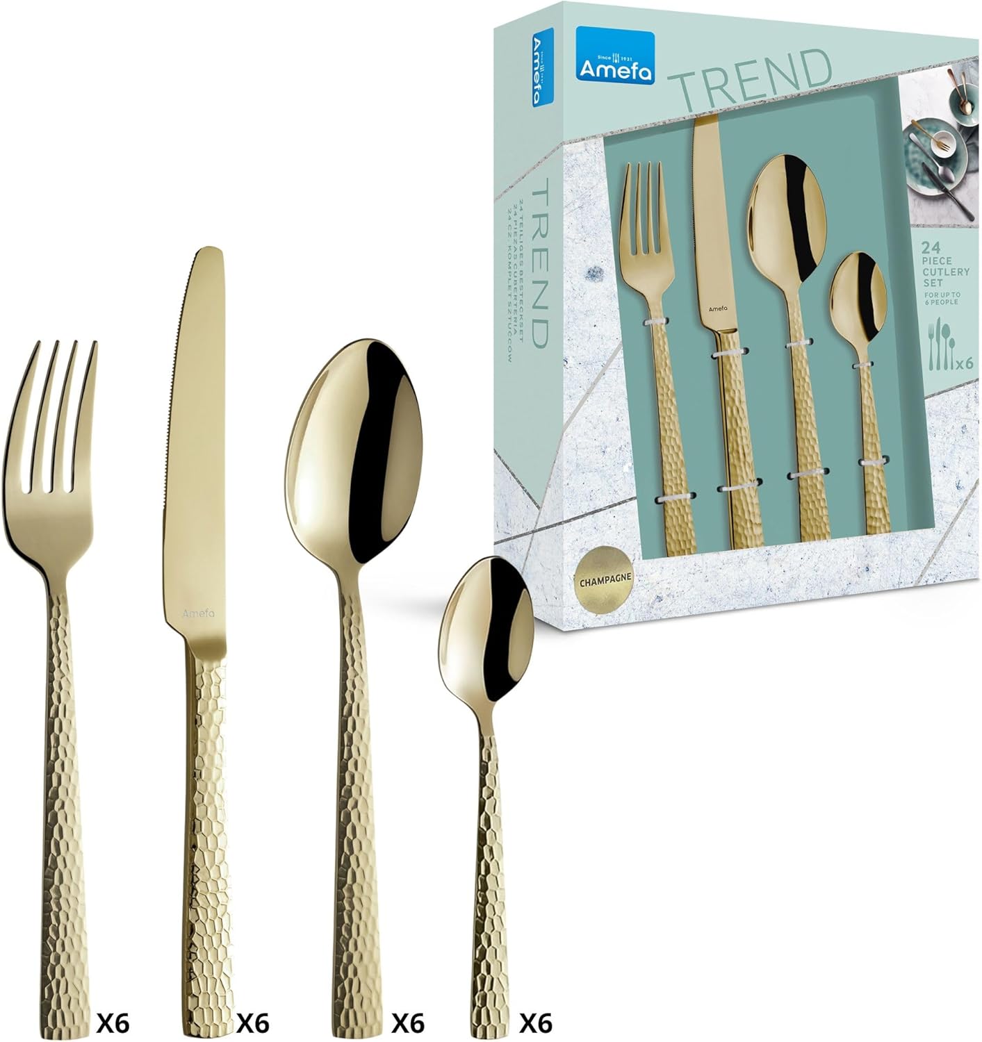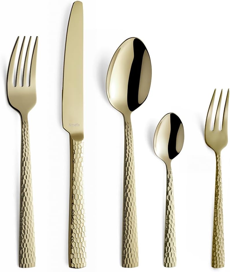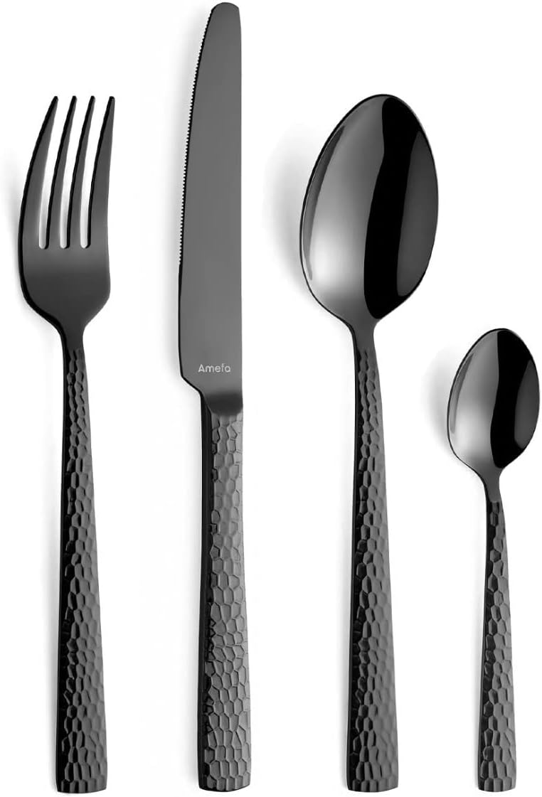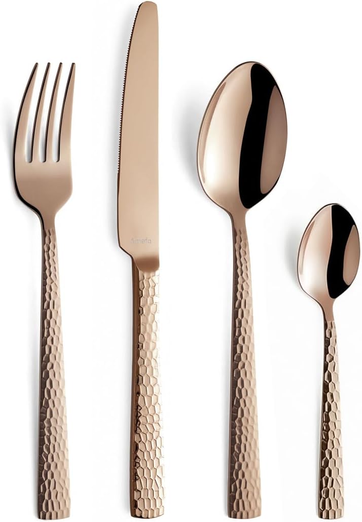 Комплект прибори за хранене Amefa Felicity, 24-частичен комплект прибори за хранене, комплект прибори за хранене за 6 души, неръждаема стомана 18/0, острие от стомана 13/0, кована дръжка, с нож, вилица, лъжица и чаена лъжичка