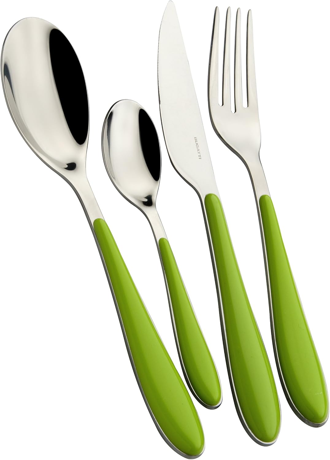Прибори за хранене, изработени от неръждаема стомана 18/10 , с прозрачна SAN дръжка с цветни акценти. Произведени по технологията за двойно формоване Pro-Tech System на Bugatti, тези прибори имат прозрачен ефект и осигуряват ярки, непроменени цветове с течение на времето . Тези бляскави прибори за хранене са подходящи за миене в съдомиялна машина при средни до ниски температури от 50-55°C. Следвайте инструкциите за грижа, включени в продукта , за да го запазите в най-добрия си вид за години напред .