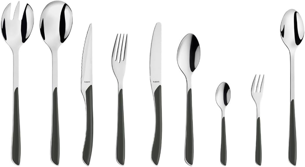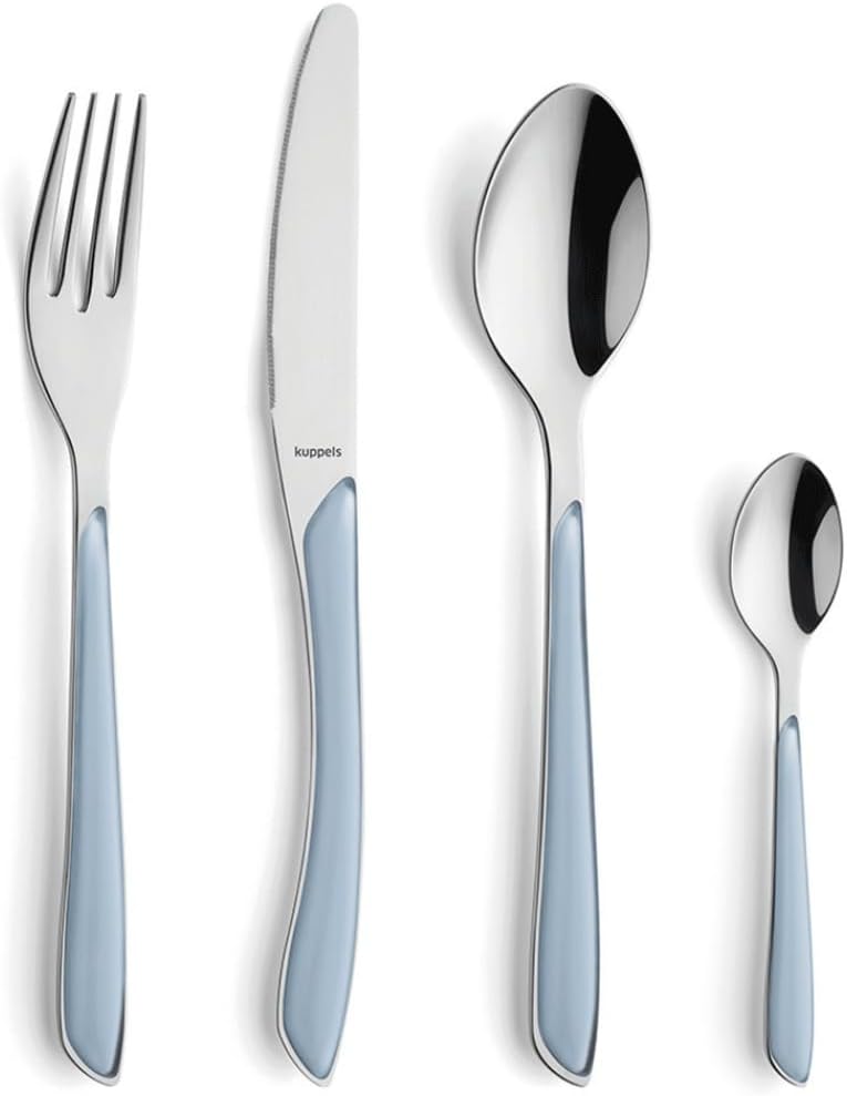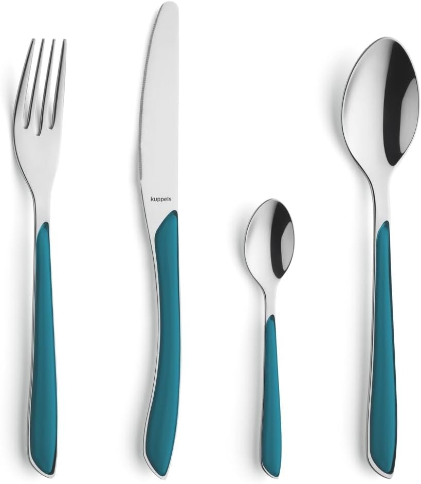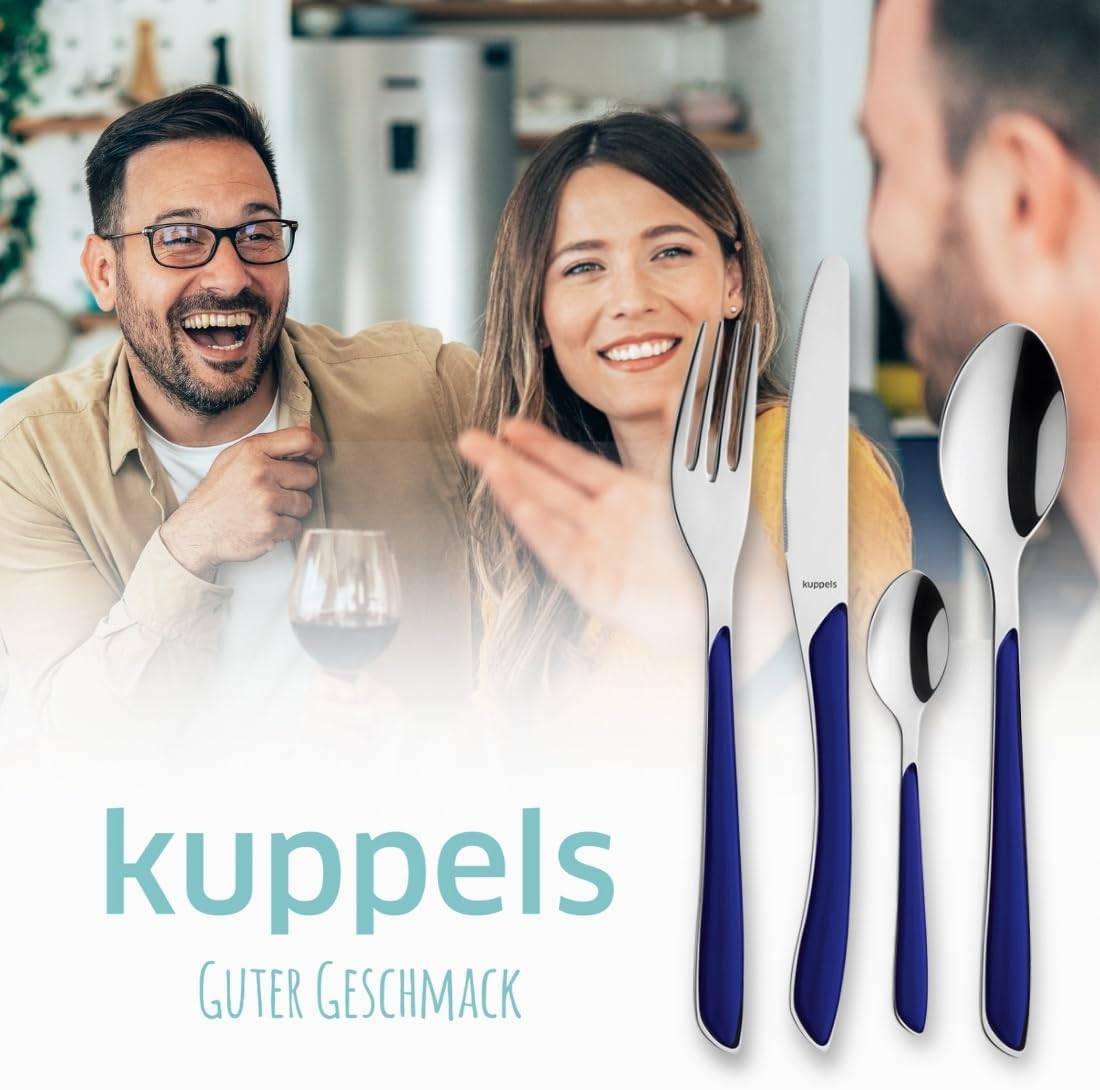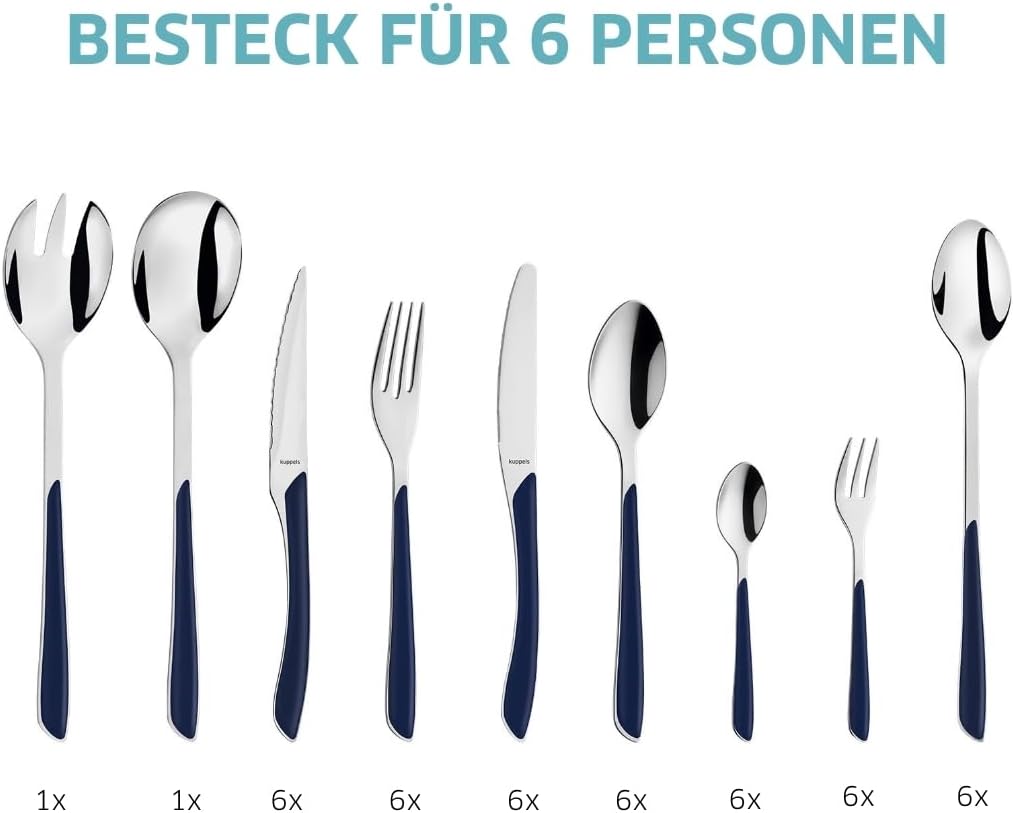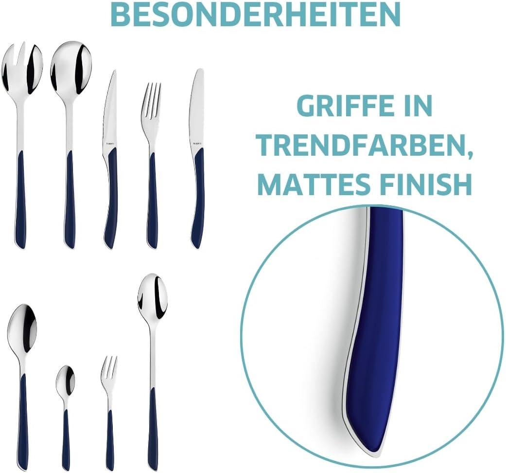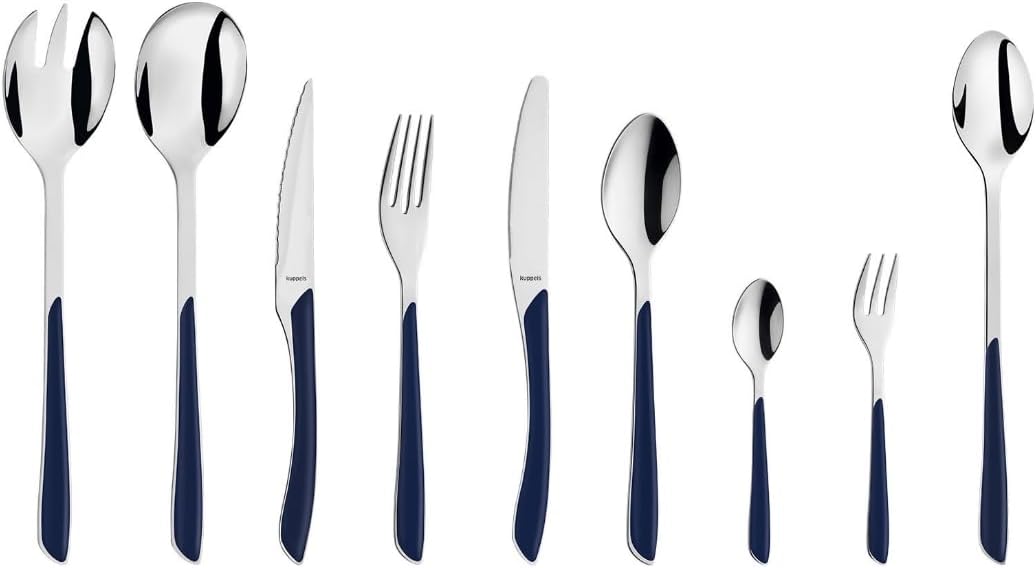 Комплект прибори за хранене Kuppels PRISMA, изработен от матова неръждаема стомана, 44 части за 6 души, висококачествени индигово сини пластмасови дръжки, устойчиви на ръжда, подходящи за съдомиялна машина