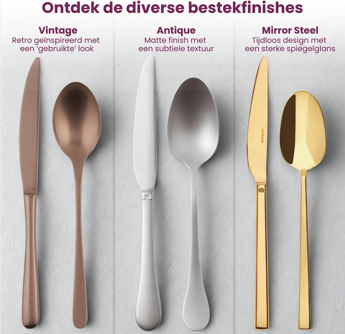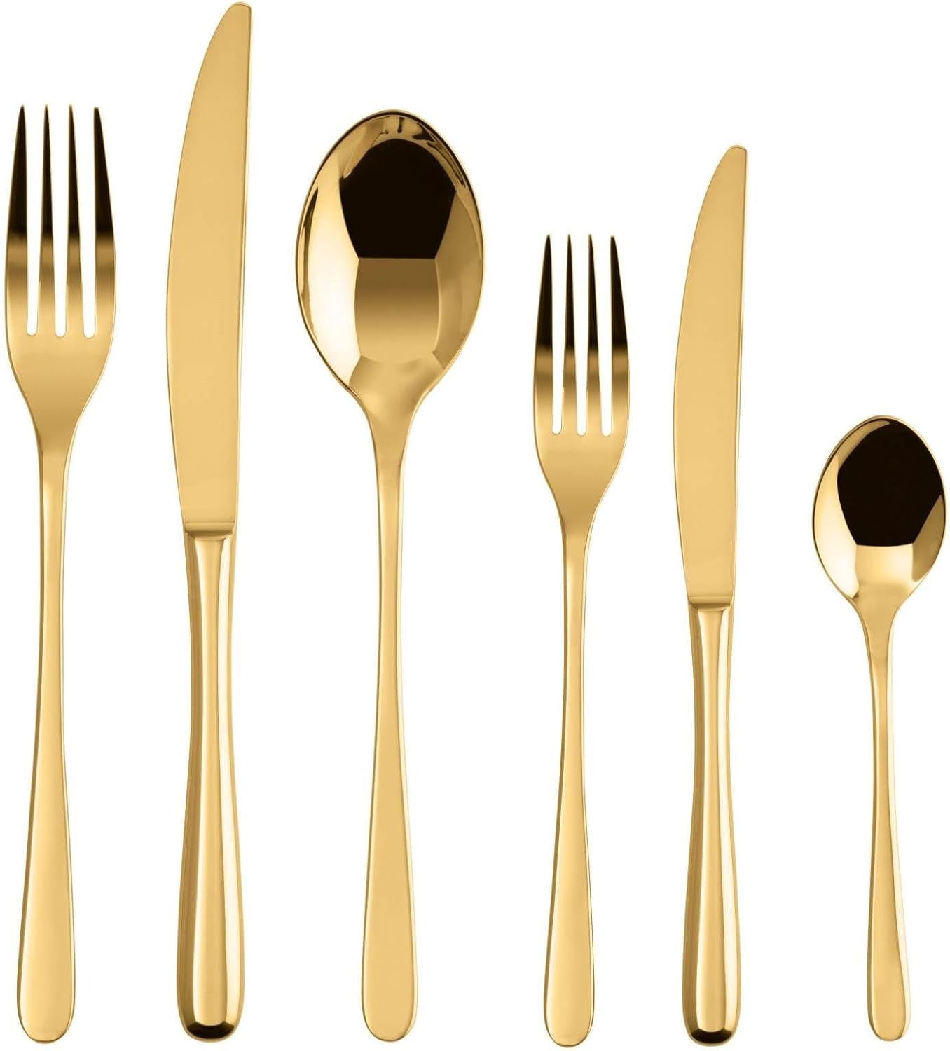 Комплект прибори за хранене Sambonet Taste от 36 части за 6 души, включително 6 лъжици за хранене, 6 вилици за хранене, 6 ножа за хранене, 6 вилици за плодове, 6 ножа за плодове и 6 чаени лъжички, изработен от неръждаема стомана с PVD покритие, подходящ за съдомиялна машина, златист цвят