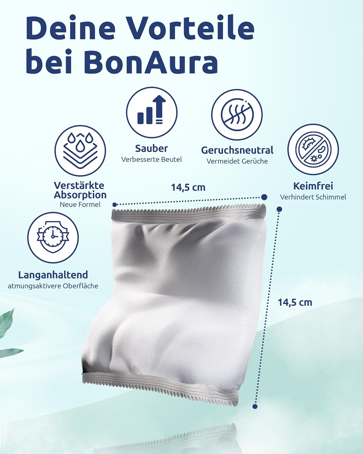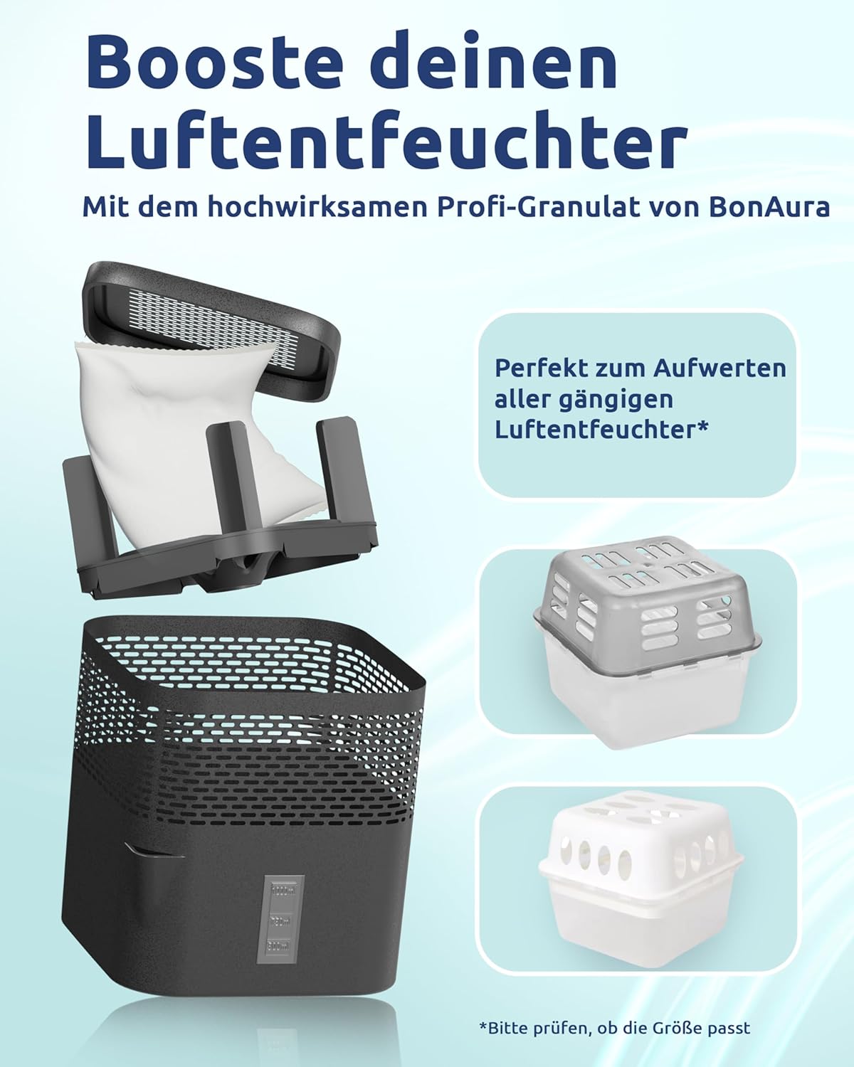 Борете се с влагата с пълнителя за обезвлажнител BonAura AirOne! Този пакет за пълнене на гранули за обезвлажнител е специално разработен за употреба във вашия обезвлажнител BonAura и в комбинация с вашето устройство осигурява постоянно сух, приятен въздух в помещението. Комплектът съдържа четири торбички за обезвлажнител, всяка с по 450 г гранули за обезвлажнител, които сигурно свързват влагата и по този начин осигуряват здравословен климат в помещенията. Качеството на BonAura е синоним на ефективност и надеждност: една торбичка за обезвлажнител издържа до три месеца и предпазва помещенията ви от мухъл и неприятни миризми, като свързва излишната влага в пакета за пълнене на гранули за обезвлажнител. Този пакет за пълнене Bon Aura пасва идеално на всички модели обезвлажнители BonAura и гарантира най-добри резултати в комбинация с вашето устройство. Пакетът за пълнене BonAura AirOne позволява лесно приложение без кабели или батерии. Просто поставете торбичката за пълнене на обезвлажнител във вашия обезвлажнител BonAura и гранулите ще разгърнат пълния си ефект - без допълнителен разход на енергия. Влагата е здраво свързана и остава задържана във вашето устройство BonAura, докато торбичката не бъде сменена. Със солевия влагоабсорбатор във вашия BonAura влагоабсорбатор можете да постигнете забележими резултати: хол, спалня или детска стая, офиси или мазета са надеждно защитени от влага. Комплектите за пълнене на влагоабсорбаторите са идеални за всички зони, предразположени към висока влажност, и осигуряват свеж, приятен вътрешен климат. Комплектът за пълнене на гранули за влагоабсорбатор е идеалното решение, за да осигурите на вашия BonAura влагоабсорбатор максимална производителност и издръжливост. Вземете вашия комплект за пълнене на гранули Bonaura 450 г и усетете разликата - вашият надежден спътник за осигуряване на здравословен и сух вътрешен климат в комбинация с вашия BonAura влагоабсорбатор.