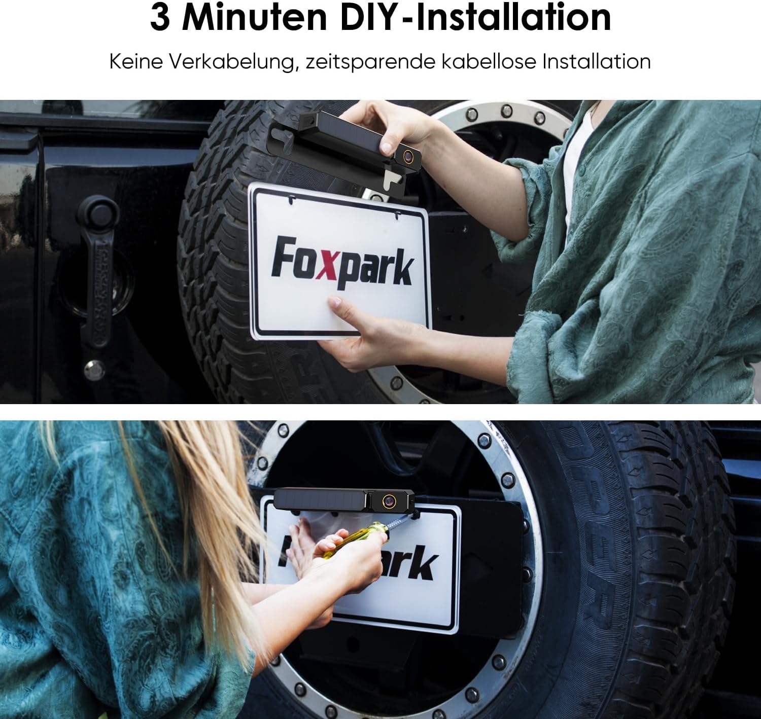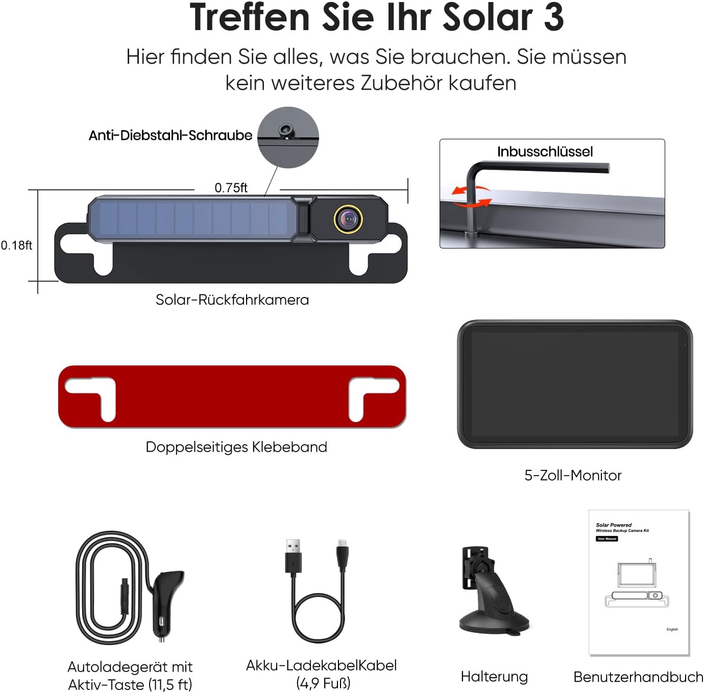 • Камера, захранвана от батерии и слънчева енергия: Край на честото зареждане! Нашата камера за заден ход, захранвана от слънчева енергия, с батерия и соларен панел, значително удължава времето за работа. Допълнителното монтиране на камера за заден ход е изключително лесно – гъвкаво и с ниска поддръжка.