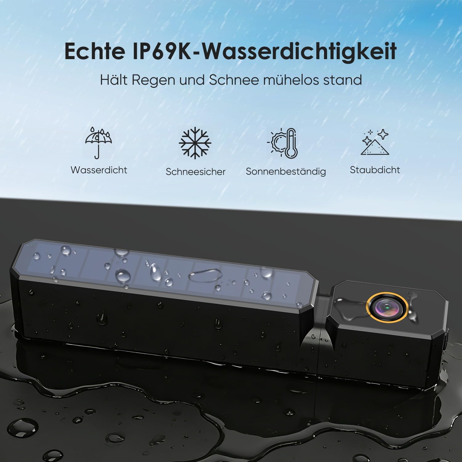 • Превъзходно нощно виждане и изключително устойчива на атмосферни влияния: Безопасна през деня, нощта и при дъжд! Ясна видимост в тъмното (по-мощни инфрачервени светодиоди). Здравата, безжична, захранвана от слънчева светлина камера за заден ход е прахоустойчива/водоустойчива по IP69K – вашият надежден партньор при всякакви метеорологични условия.