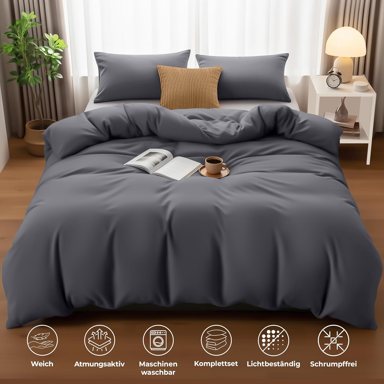 Нашият комплект завивки е изработен от здрава и издръжлива материя, която запазва яркостта и формата си, за да осигури перфектен външен вид на вашата спалня и комфортен сън. Плътната тъкан от микрофибър позволява на течностите да образуват капчици и да се задържат върху повърхността на плата за кратко време, вместо да попиват веднага. Това го прави много устойчив. Ако можете да почистите течността, преди да е проникнала в плата, ще бъде все едно нищо не е попаднало върху мебелите ви.