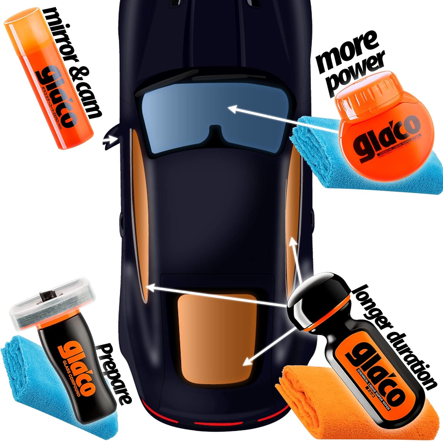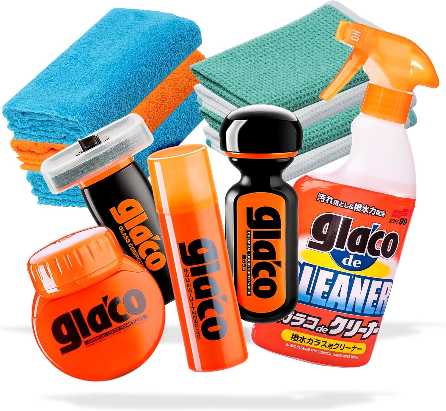 Комплект за автомобилни стъкла detailmate: Soft99 Glaco de Cleaner, Ultra Glaco, Roll-on Large, Mirror Coat Zero, Glass Compound Roll-on + 4 x микрофибърни кърпи Monkey Waffle + 3 x кърпи за полиране