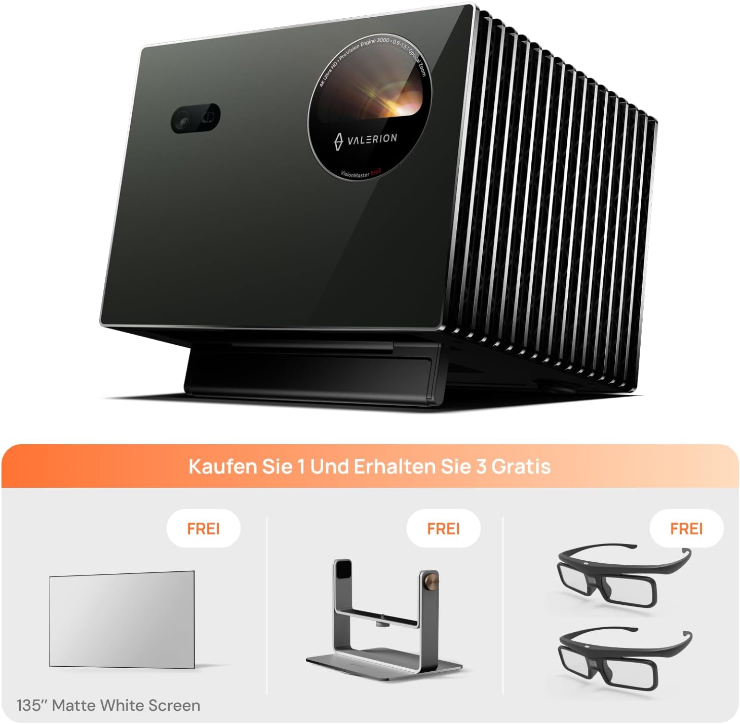 Комплект за домашно кино Valerion - Включва проектор Valerion Pro2 4K + 135-инчов матово бял екран + настолен гимбал + 3D очила