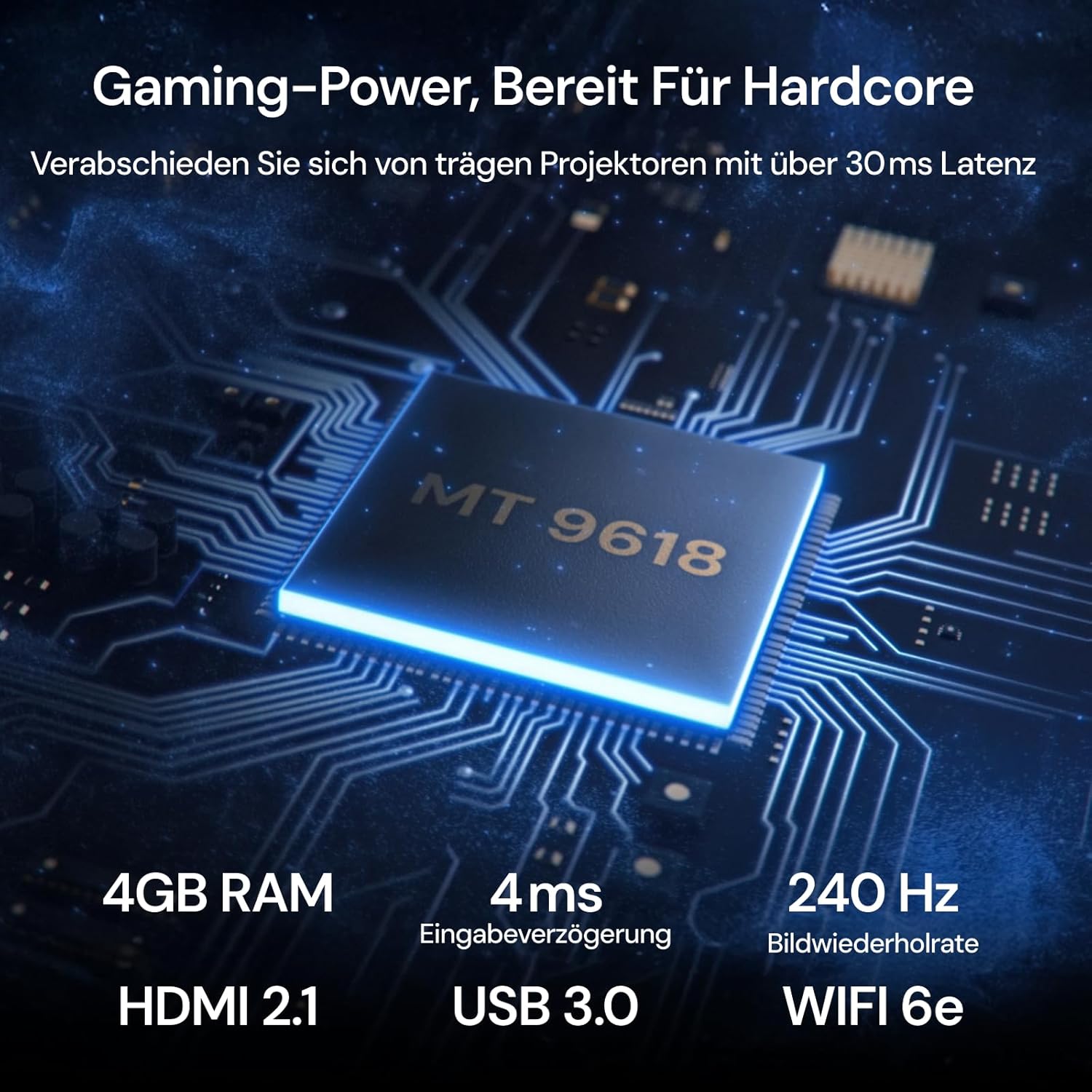 • 4K стрийминг, готов за бъдещето - Изживейте бъдещето на проекцията с най-съвременния чипсет Al-SoC MT9618, който е оборудван с 4GB RAM и 128GB ROM, осигурявайки значително по-висока производителност в сравнение с традиционните 2GB/32GB проектори. С подобрена памет и разширен капацитет за съхранение можете да се наслаждавате на безпроблемно многозадачност, по-бързо превключване между приложения и по-плавно 4K UHD стрийминг – без неудобството от забавяния. С тази технология, готова за бъдещето, вие сте постоянно подготвени за бъдещите изисквания.