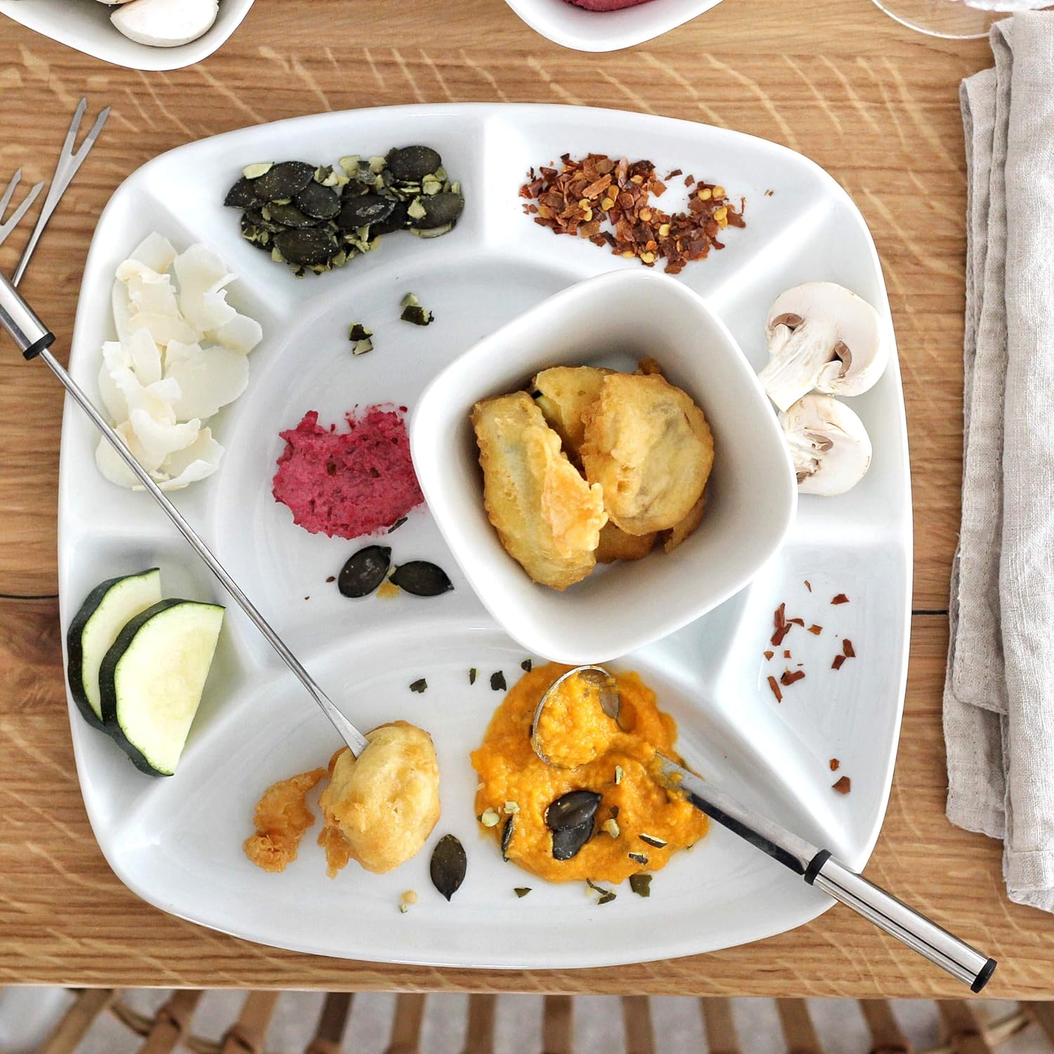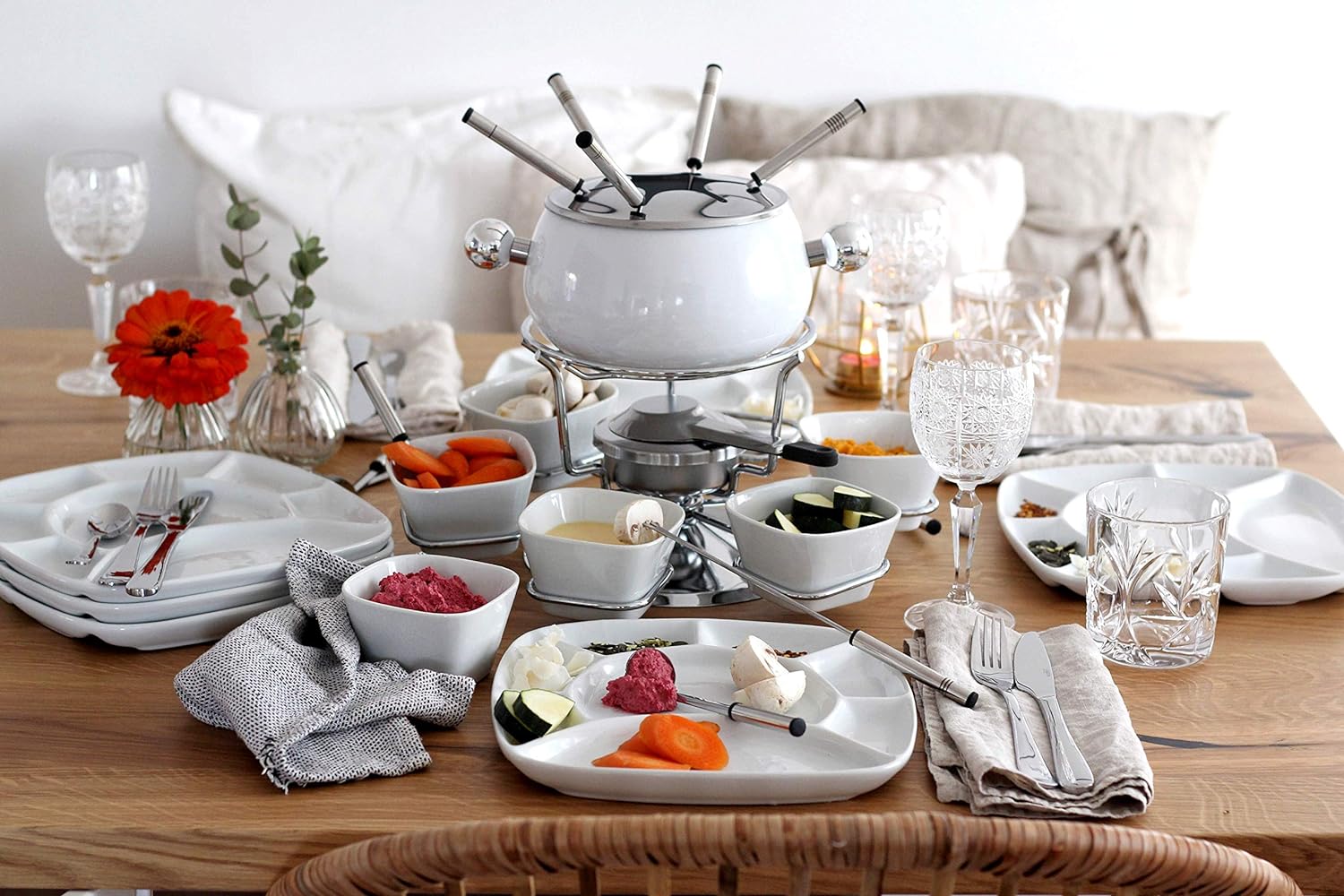 Независимо дали е Нова година, Коледа или друг повод: уютната фондю вечер събира приятели и семейство и Ви дава незабравими часове в празнична атмосфера! Този лъскав бял комплект за фондю от марката MÄSER, изработен от неръждаема стомана, емайлиран съд за фондю, както и купи и чинии за фондю, изработени от марков порцелан, включва пълно оборудване за 6 души. Със своя стабилен резервоар, който държи тенджерата здраво на място, с безшевния предпазител срещу пръски и с регулируемата, презареждаема горелка за предпазна паста, включително гасителен капак, този комплект за фондю не оставя нищо желано не само по отношение на оборудването, но и по отношение на безопасност. Насладете се на обилно фондю с месо, както и на други творения с фондю по ваш избор с този комплект. Съветваме само да не го използвате за фондю с шоколад или сирене, тъй като сиренето и шоколадът могат да загорят върху емайловото покритие. Моля, работете с горелката само с горивна паста - не със спирт или други запалими течности. (Препоръчваме да използвате патрони с горивна паста MÄSER 871892.)