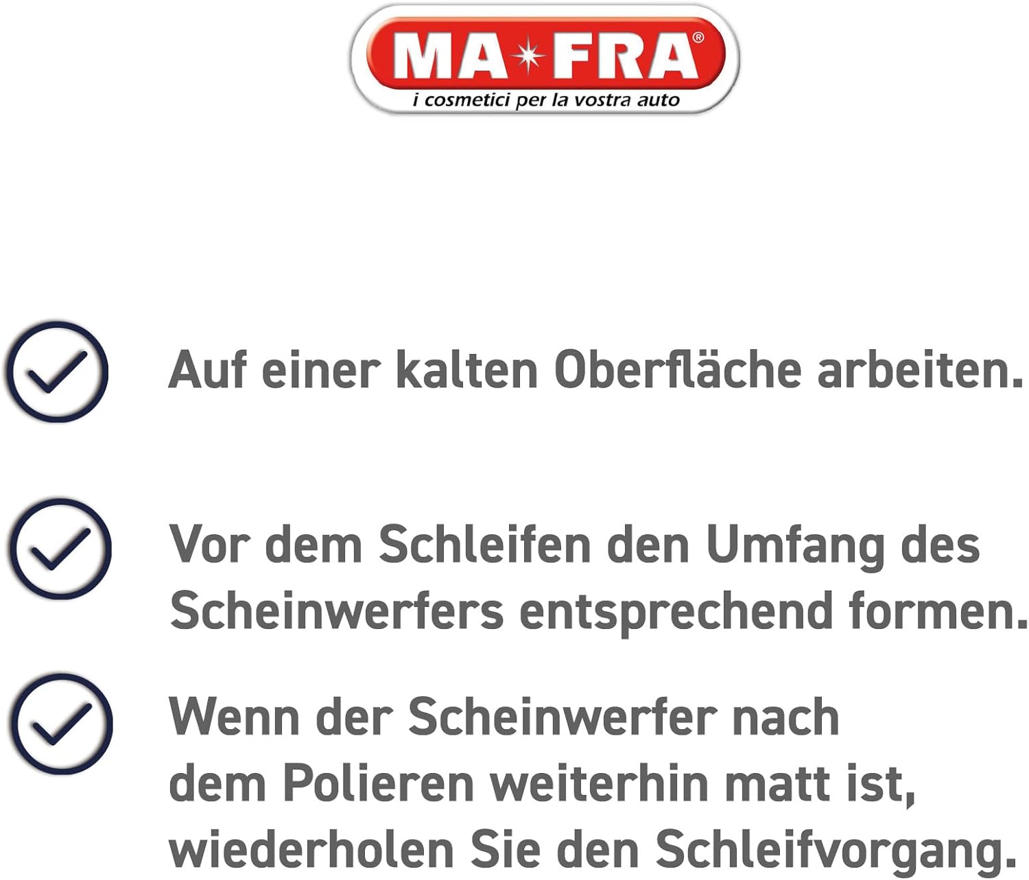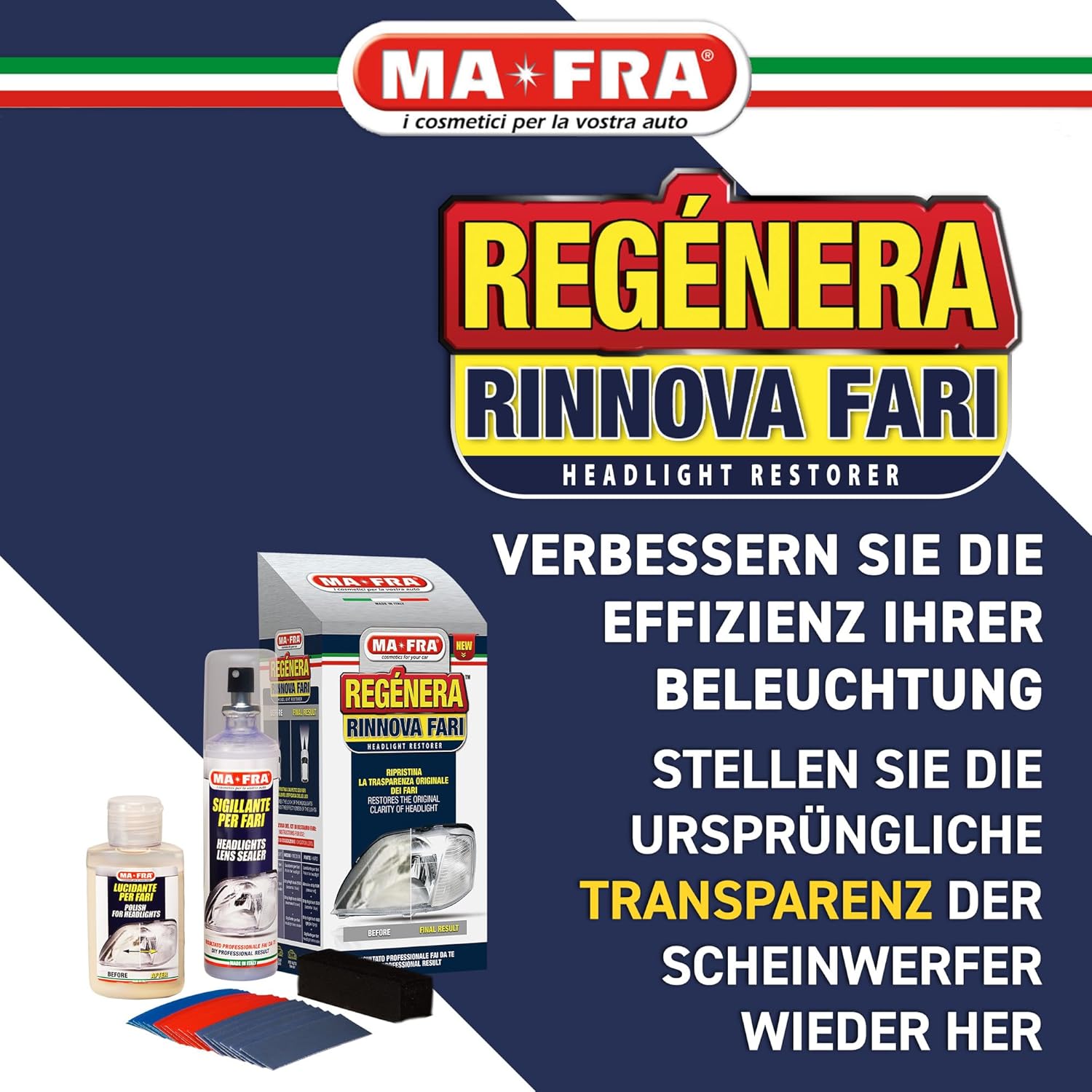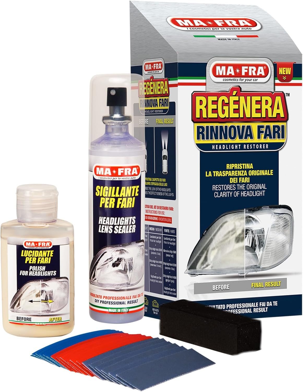 Комплект за грижа за автомобилни фарове Mafra - Включва уплътнител, полираща паста и шкурка - Възстановява оригиналния вид на автомобилните фарове и подобрява яркостта