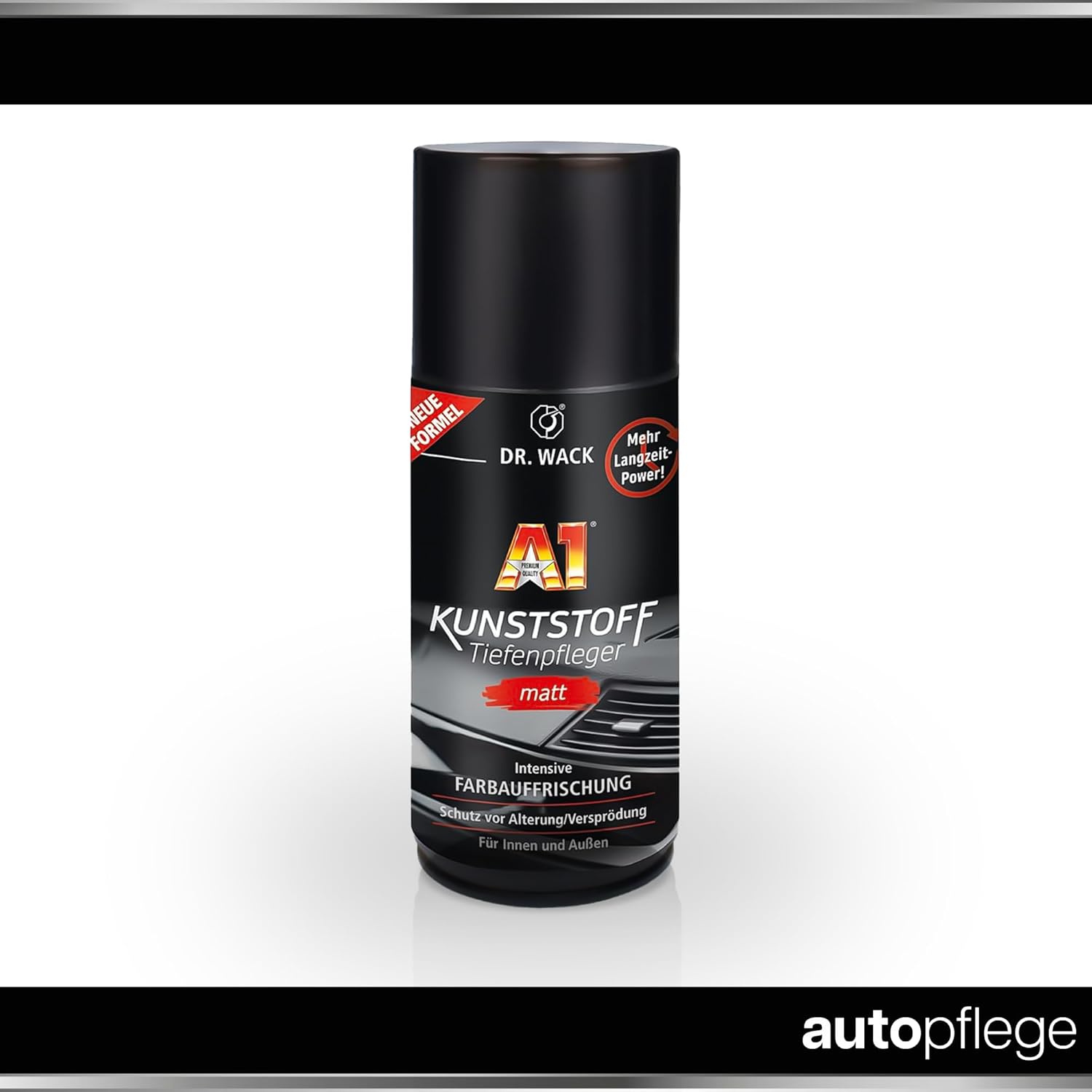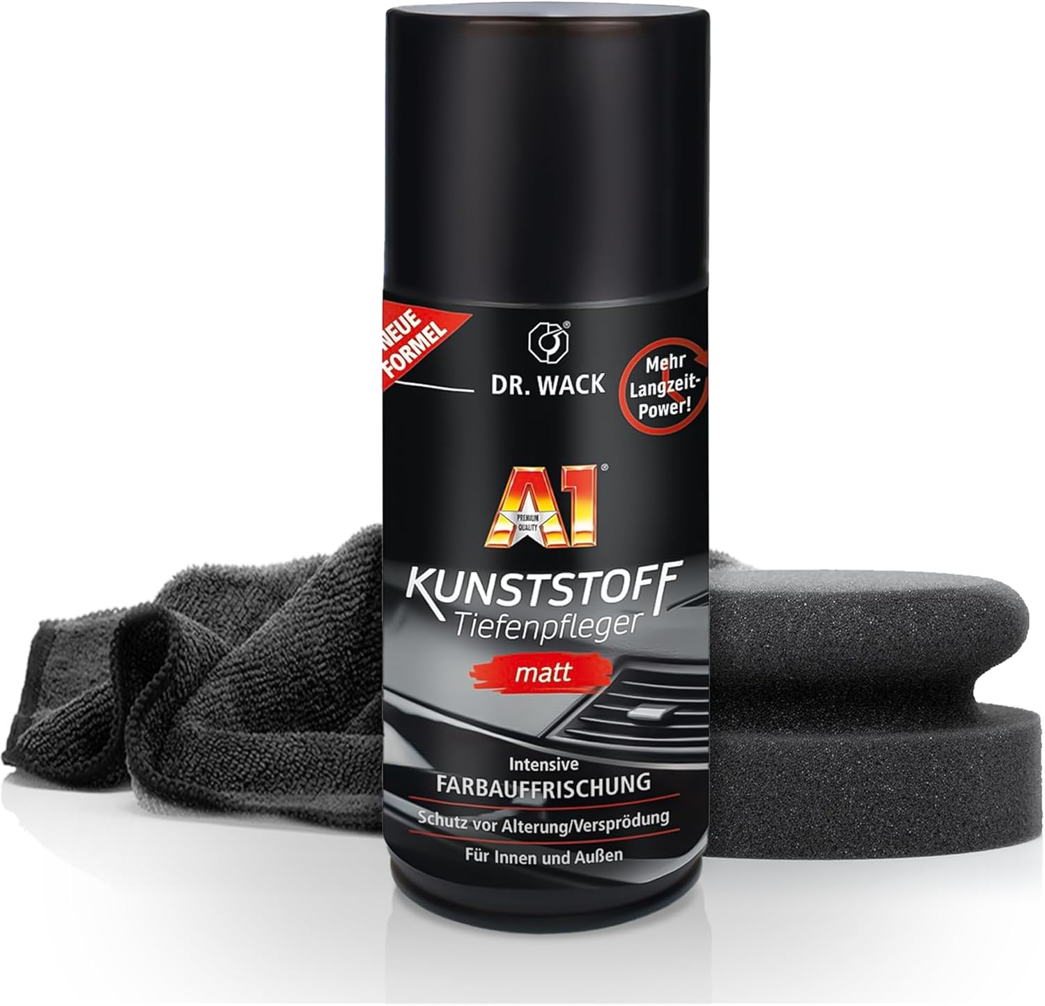 Комплект за грижа за автомобилни пластмаси за вътрешна и външна употреба | Dr. Wack A1 Plastic Deep Care Matt 250 мл + гъба за нанасяне + кърпа за полиране | За интензивно освежаване и грижа на цвета
