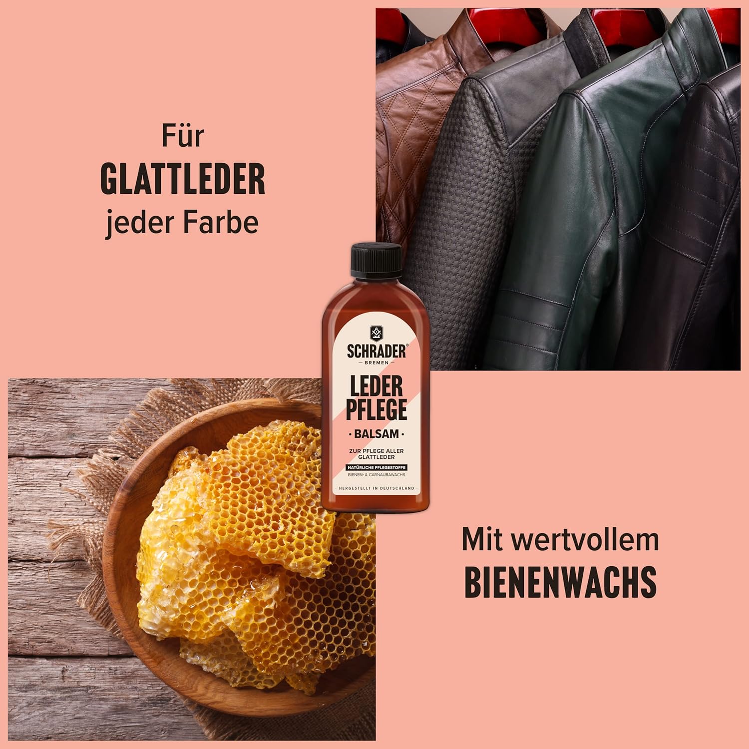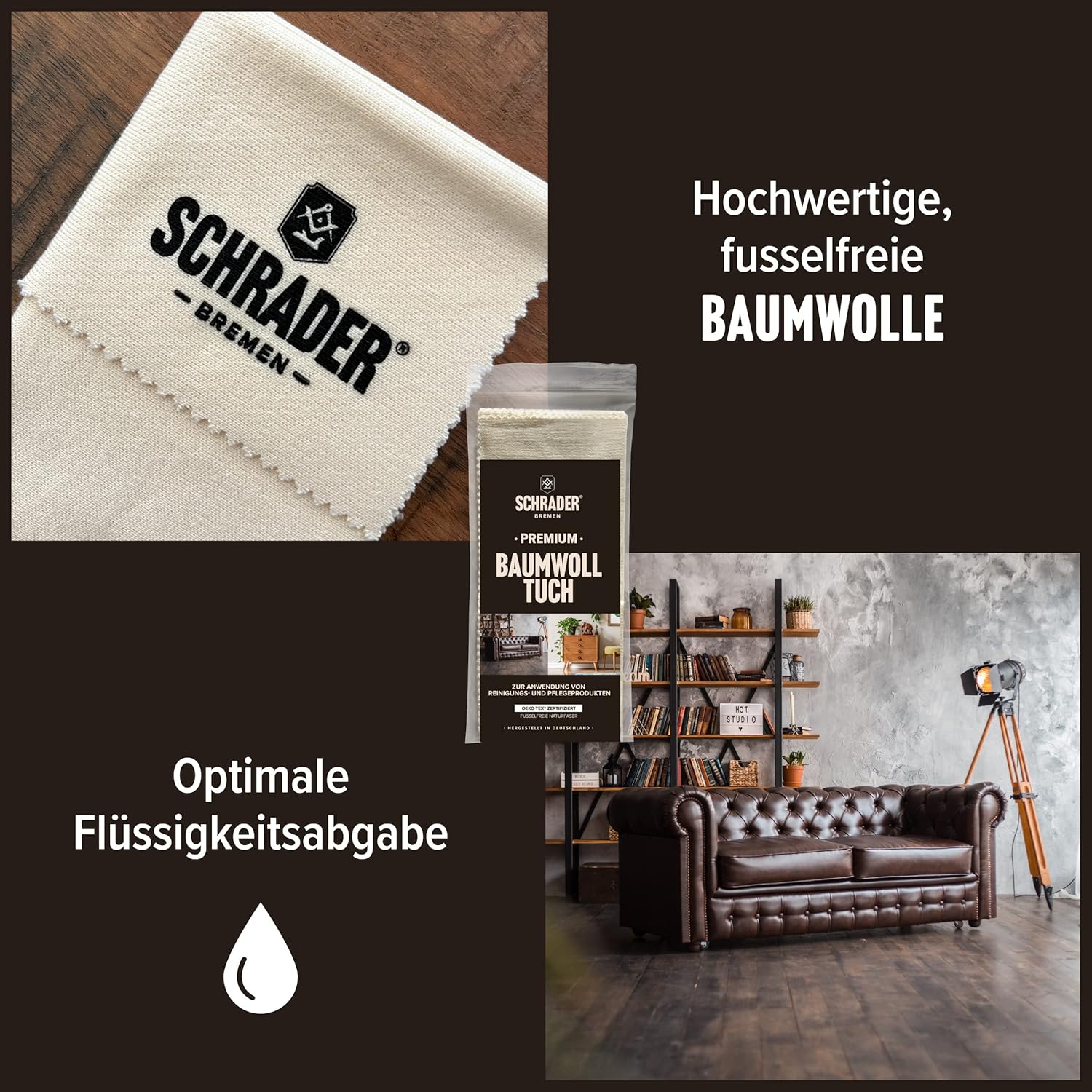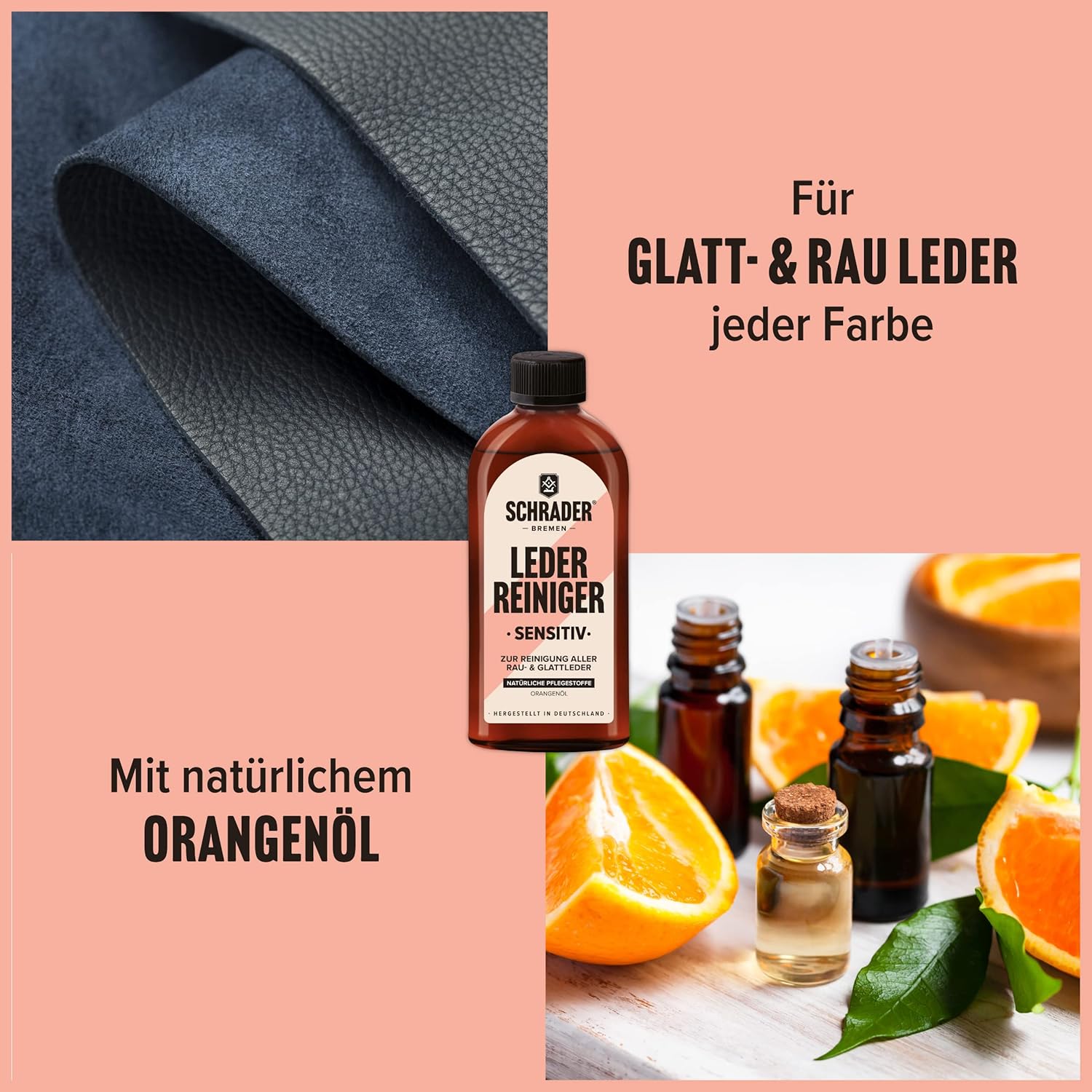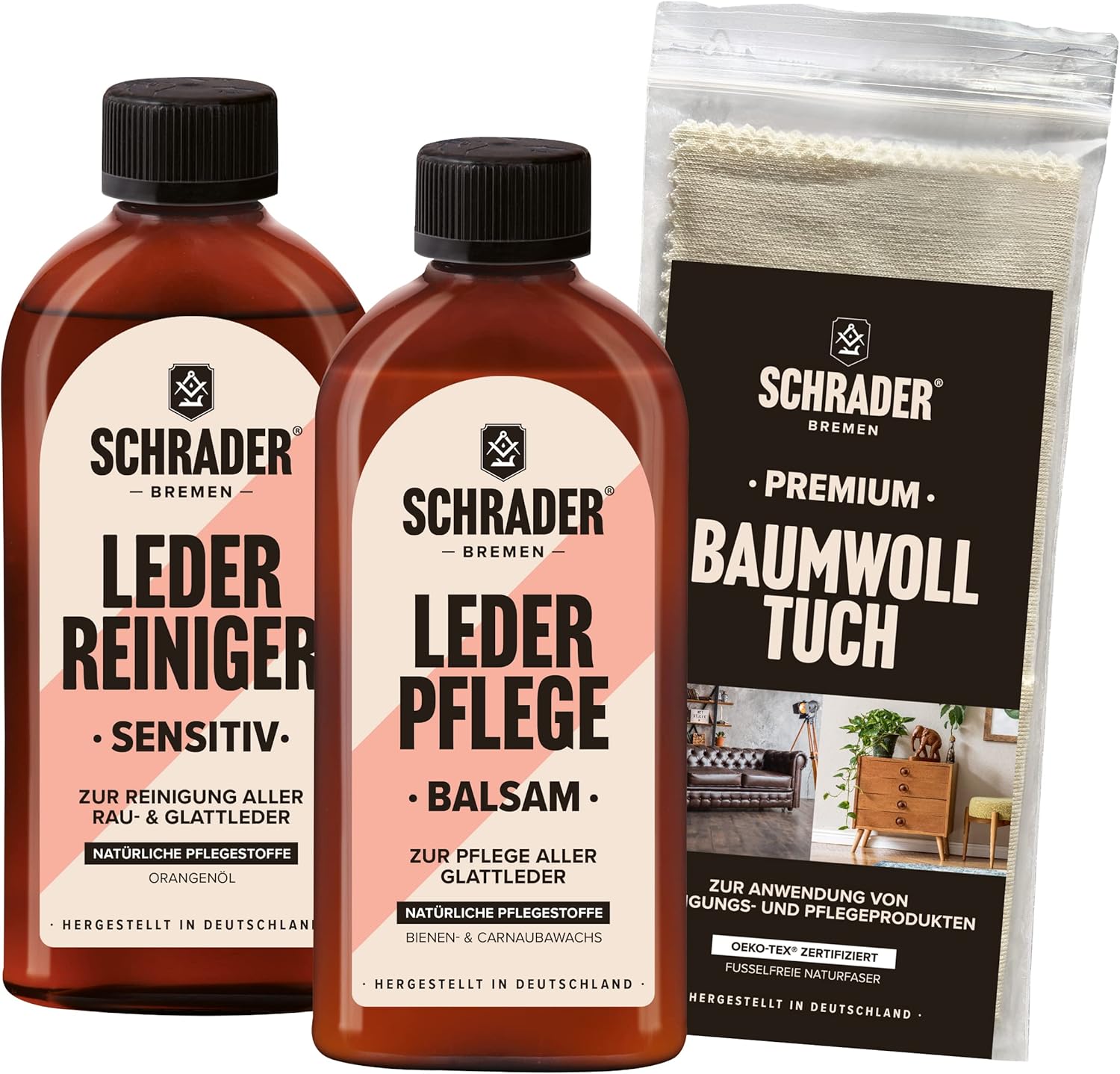 Комплект за системна грижа с 1 x 250 мл почистващ препарат за чувствителна кожа, 1 x 250 мл балсам за грижа за кожа и 1 x първокласна памучна кърпа (25 x 33 см). Употреба: почистващият препарат за чувствителна кожа е подходящ за всички видове груба и гладка кожа от всякакъв цвят. Той нежно премахва замърсяванията и освежава естествената красота на кожата. Балсамът за кожа подхранва всички видове гладка кожа от всякакъв цвят. Растителните восъци осигуряват импрегниране на повърхността и по този начин я предпазват от влага и замърсявания. Продуктът прави кожата блестяща и красива и я поддържа еластична при редовна употреба. Първокласната памучна кърпа е идеална за нанасяне и полиране на почистващи препарати и балсами. Тя е без власинки и е изработена от висококачествени влакна.