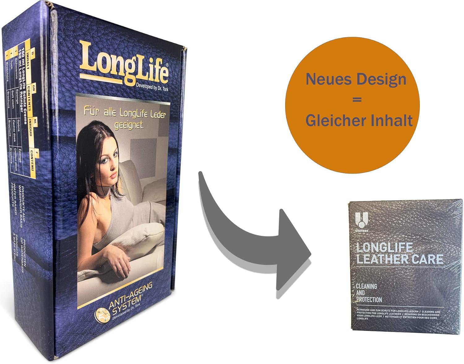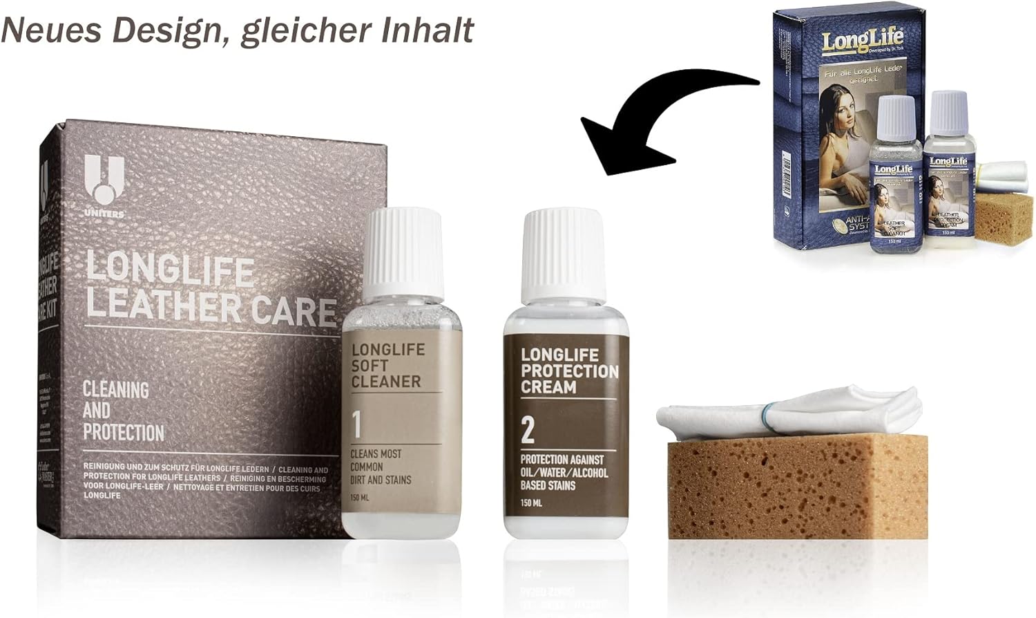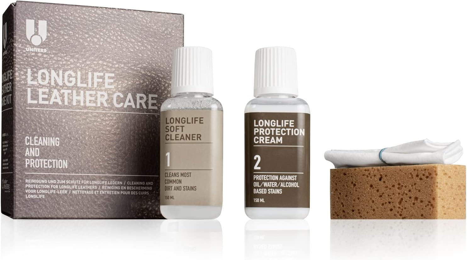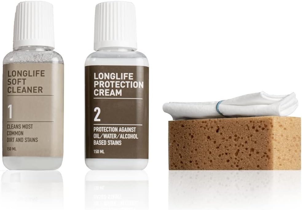 Комплектът се състои от следните аксесоари: - Защитен крем LongLife, бутилка 150 мл - Почистващ препарат LongLife Soft, бутилка 150 мл - Мека кърпа - Гъба - Инструкции за употреба на почистващия препарат LongLife Soft - Почистващ препарат LongLife Soft - Почистващ препарат на водна основа - Може да се използва върху всички видове гладка кожа - Лек почистващ препарат - На водна основа, почиства повечето замърсявания и петна - Почистващият препарат Leather Soft не съдържа защитен крем LongLife Solvent - Включва системата против стареене Anti-Aging(R) на Dr. Tork - На водна основа, може да се използва върху всички видове гладка кожа - Съдържа системата против стареене Anti-Aging(R) - Кремът образува защитна бариера срещу масло, вода и алкохолни напитки, без да уврежда дишането на кожата. Основна цена: 1 литър = 78.30 €