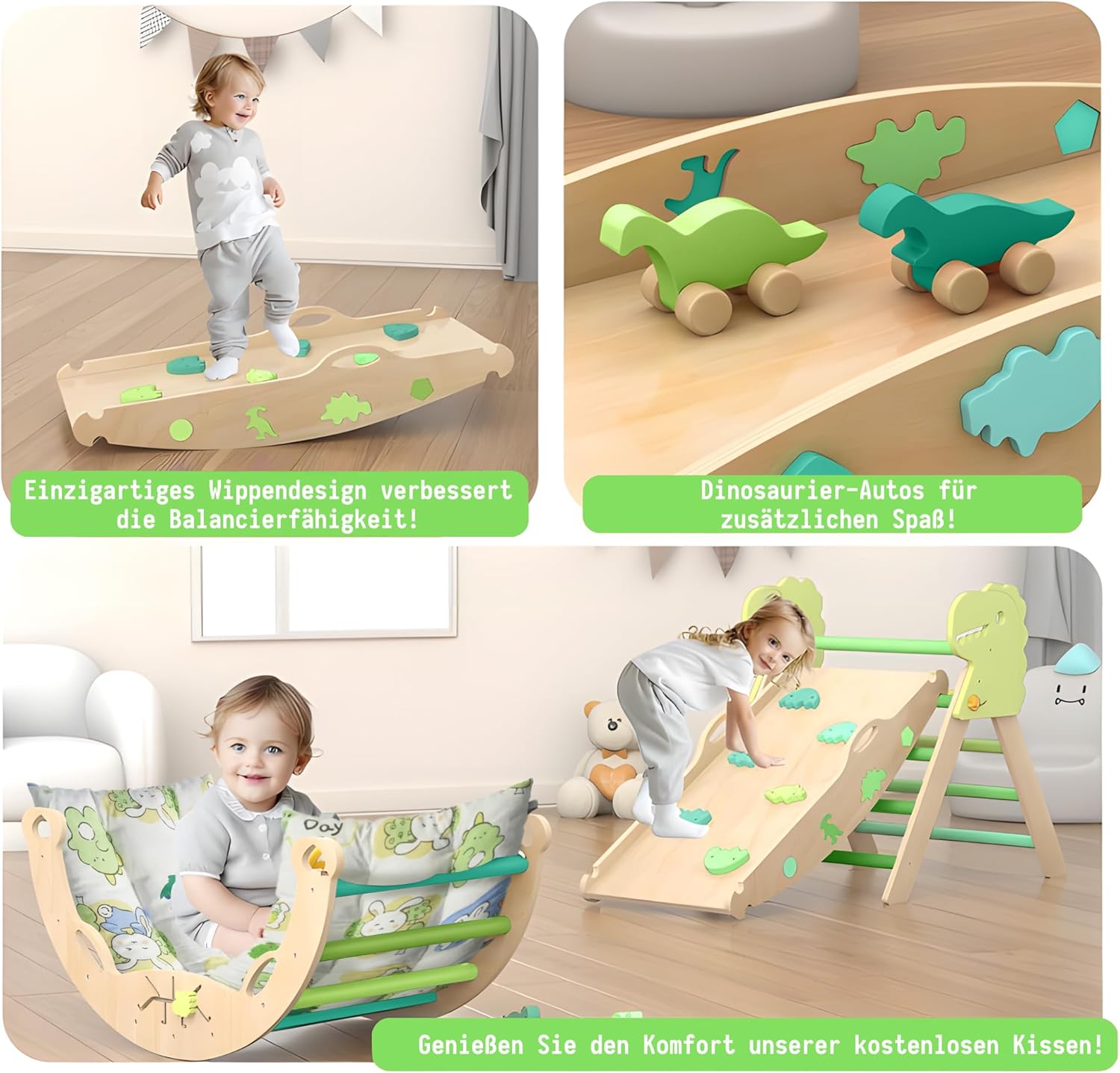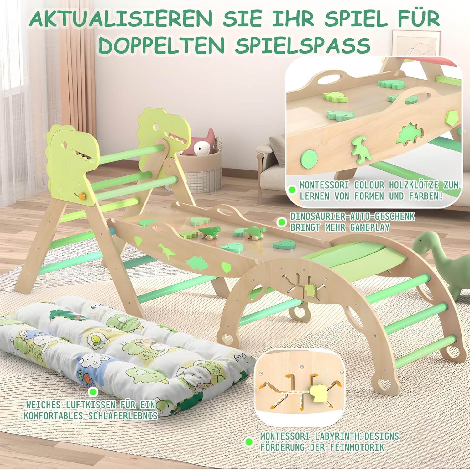 • В допълнение към детската катерушка, включени са и възглавница за седалка и две колички с динозаври. Възглавницата за седалка осигурява мека защита, а количките с динозаври допринасят за забавлението.