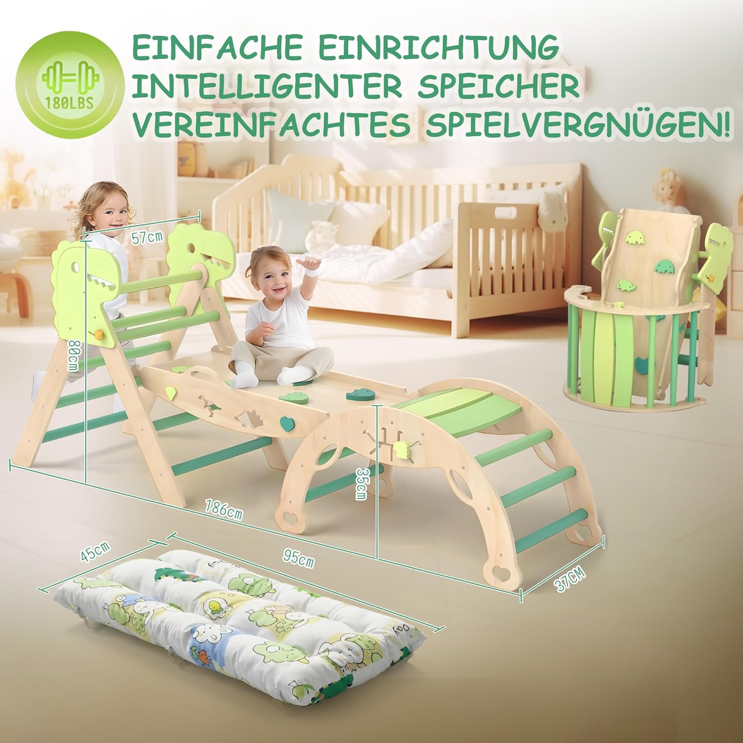 • Комплектът 9 в 1 катерушка Монтесори е специално проектиран за малки деца на възраст от 1 до 3 години и разширява удоволствието от играта на вашето дете. Катерушката включва девет функции: сортировчик по форми, лабиринт Монтесори, люлка, триъгълник за катерене, арка за катерене, арка за люлка, рампа за катерене, пързалка и тунел за игра. Идеален за закрити площадки за игра, той осигурява на малките деца безопасно пространство за изследване.