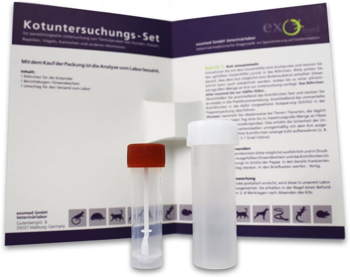 Комплектът за тестване на фекалии exomed се използва за откриване на стадии на паразити чрез фекална проба/изследване при видове влечуги, за които комплектът може да се използва: костенурки, змии, брадати агами, игуани, леопардови гекони и земноводни. Този комплект съдържа всичко необходимо за събиране на проби, необходимите аксесоари и подробни инструкции как и кога да се извърши изследване. Тестването е особено препоръчително за болни животни, новопридобити животни и преди запознаване на нови животни едно с друго. Фекалните проби се изследват с помощта на местни методи (фекална намазка и комбинирана седиментация/флотация). Редовното тестване помага за ранно откриване на вредни вътрешни паразити и предприемане на подходящи действия. След като ни изпратите пробата си, ние ще я анализираме и обикновено ще получите резултатите в рамките на 1-2 работни дни по поща, имейл или, при поискване, можем да ги изпратим директно на вашия ветеринарен лекар. Освен това имате възможност да поръчате допълнителни тестове директно от нас (напр. тестове за Cryptosporidium или Giardia срещу допълнително заплащане). С изключение на епруветката за събиране на фекалии и нейния калъф, всички материали са 100% компостируеми и следователно екологично устойчиви. Включени са: плик за доставка до вас, лабораторни анализи/резултати (вече платени с покупката на комплекта), формуляр за подаване на информация за собственика и животното, комплект за събиране на изпражнения и инструкции (епруветка за събиране на изпражнения с ръкав) и предплатен плик за връщане.