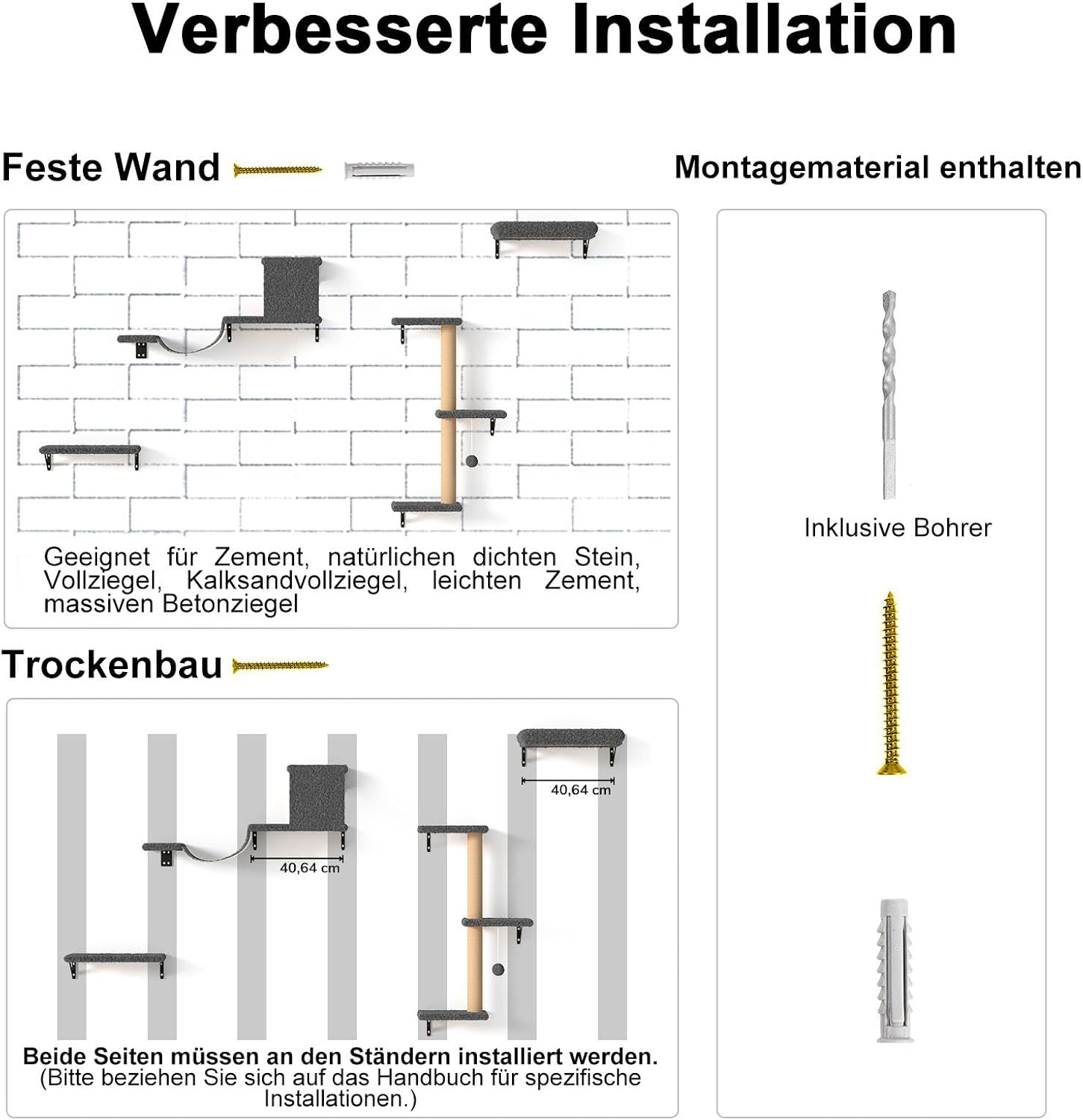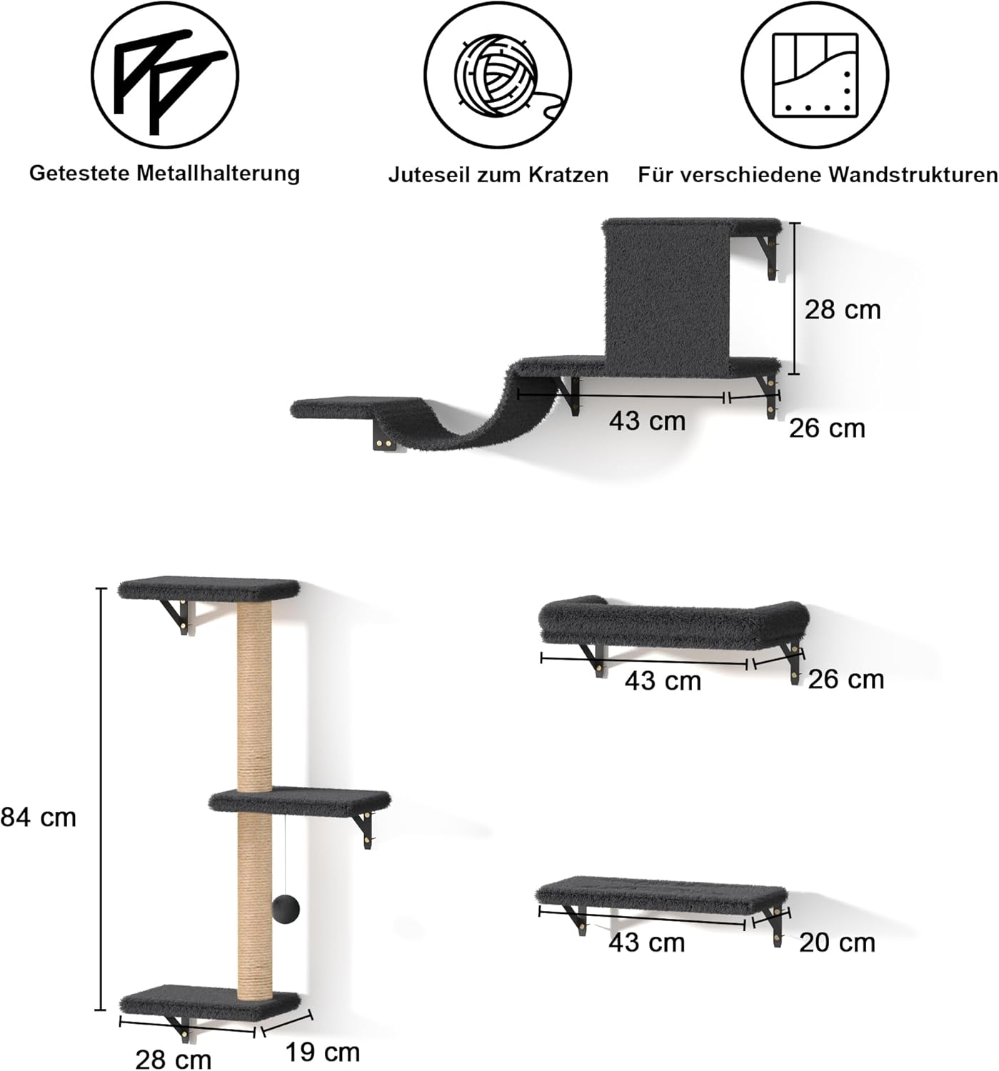 • Спестяване на място: многофункционалната катерушка за котки използва максимално вертикалното пространство във вашия дом и ви спестява място на пода. Висящият мост позволява на котката ви да вижда територията си и осигурява стабилност и близост! Сивият цвят се вписва добре в интериорния ви стил и става част от декорацията на стаята.