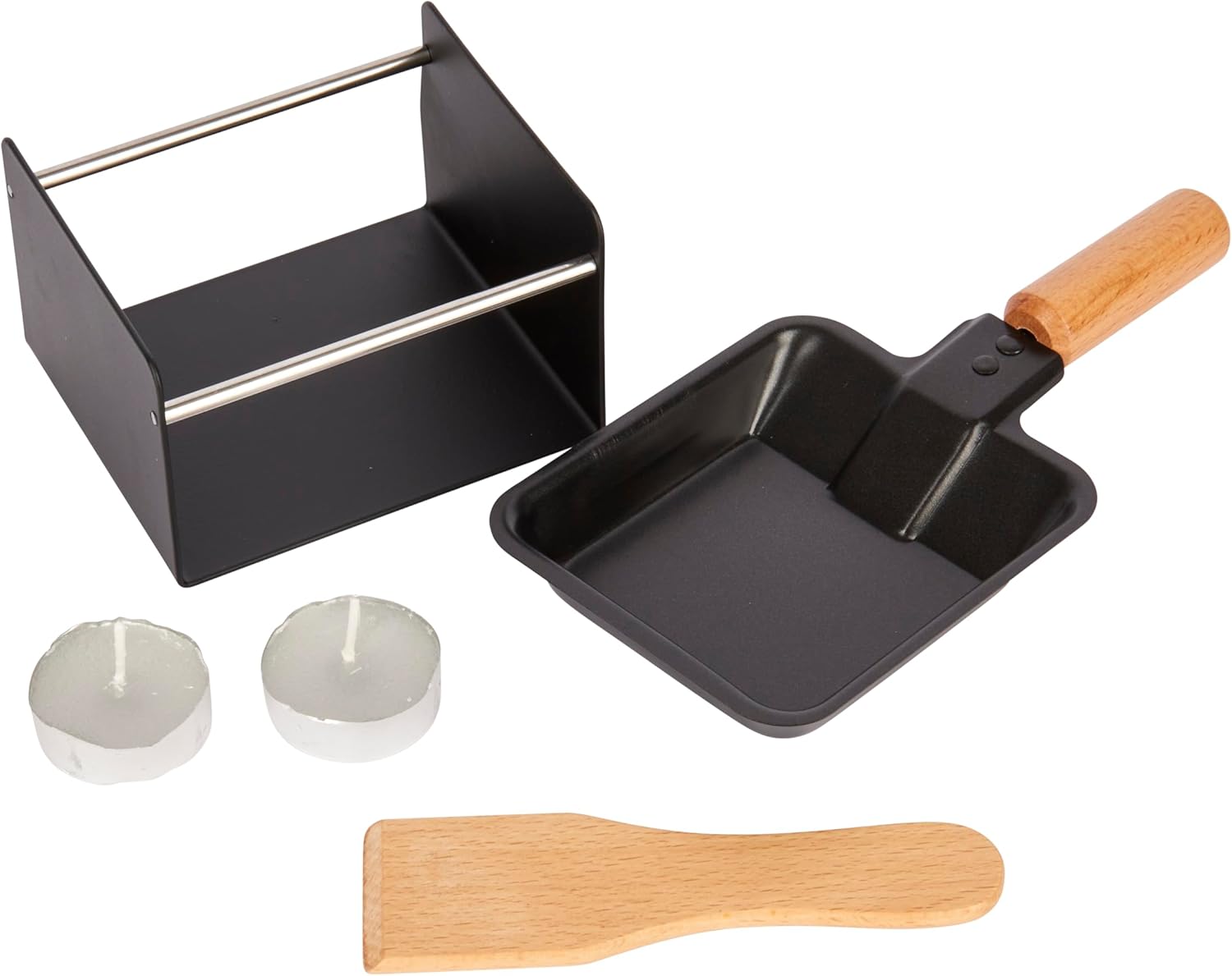 The removable, non-stick pan sits comfortably on the metal stand just above the tea lights. It has a non-stick coating that ensures that the melted cheese slides off easily and you can pour it directly over meat, potatoes or cucumbers. Thanks to the wooden handle, it can be gripped and lifted with ease.