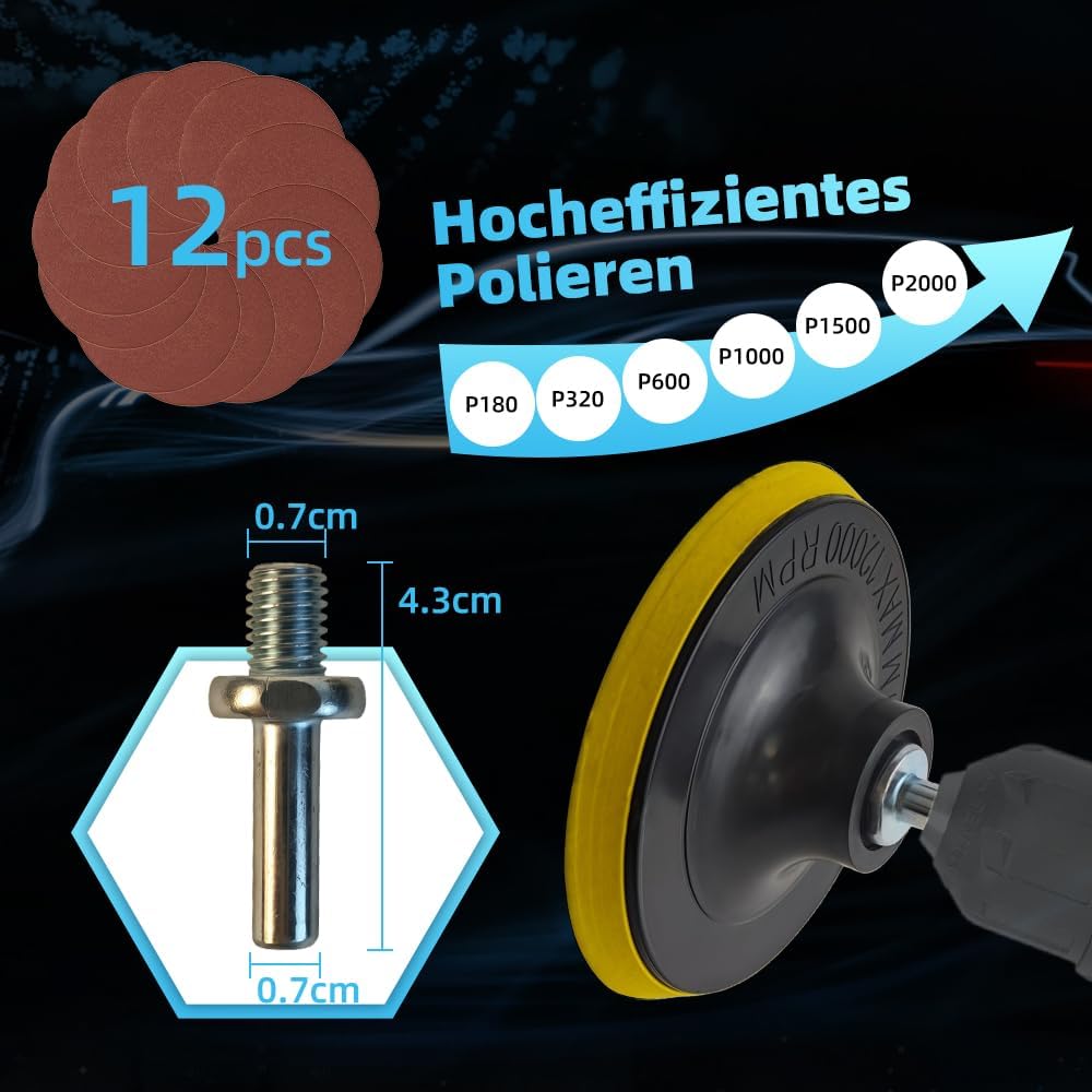 • Отлични резултати при реставрация: комплектът за ремонт на фарове с шест качества шкурка (180, 320, 600, 1000, 1500, 2000) може ефективно да елиминира в комбинация с шлифовъчния диск пожълтяване, окисляване и драскотини по фаровете. След реставрация с изпаряващия се ремонтен разтвор, върху повърхността на фара се образува равномерен защитен филм, който е устойчив на UV лъчи и окисляване. Практическите тестове потвърждават, че тази защитна бариера запазва своята ефективност повече от година. (*Забележка: действителната продължителност зависи от средата на употреба.)