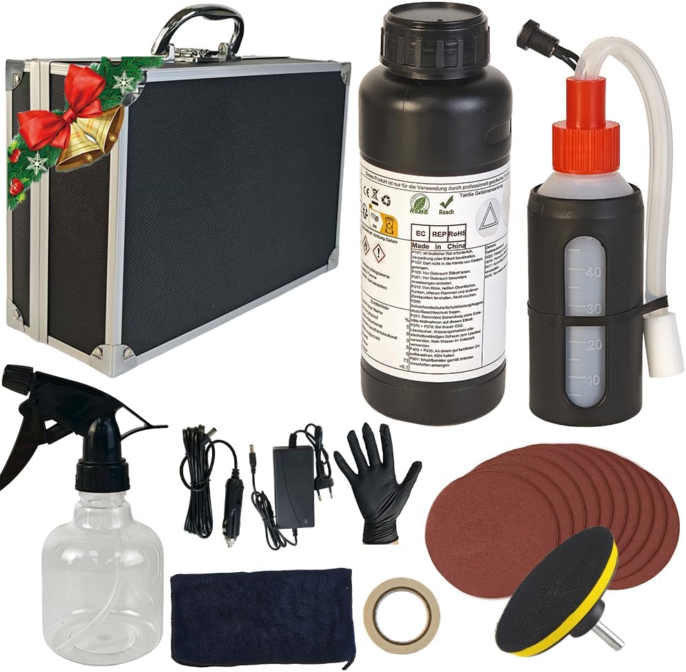 • Пълни аксесоари: 710 г ремонтен разтвор, 220V домакински захранващ кабел, 18V автомобилен захранващ кабел, 50 мл нагревателна бутилка, защитна лента, 6 степени на шкурка (180, 320, 600, 1000, 1500, 2000) *2, шкурка, спрей бутилка, кърпа, ръкавици, ръководство за употреба. Ръкавиците предпазват ръцете ви, а спрей бутилката и кърпата улесняват почистването на фаровете. Този аксесоар осигурява по-безопасна и по-удобна подготовка на фаровете.